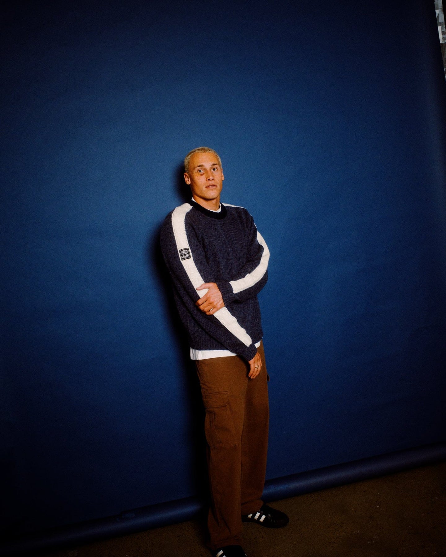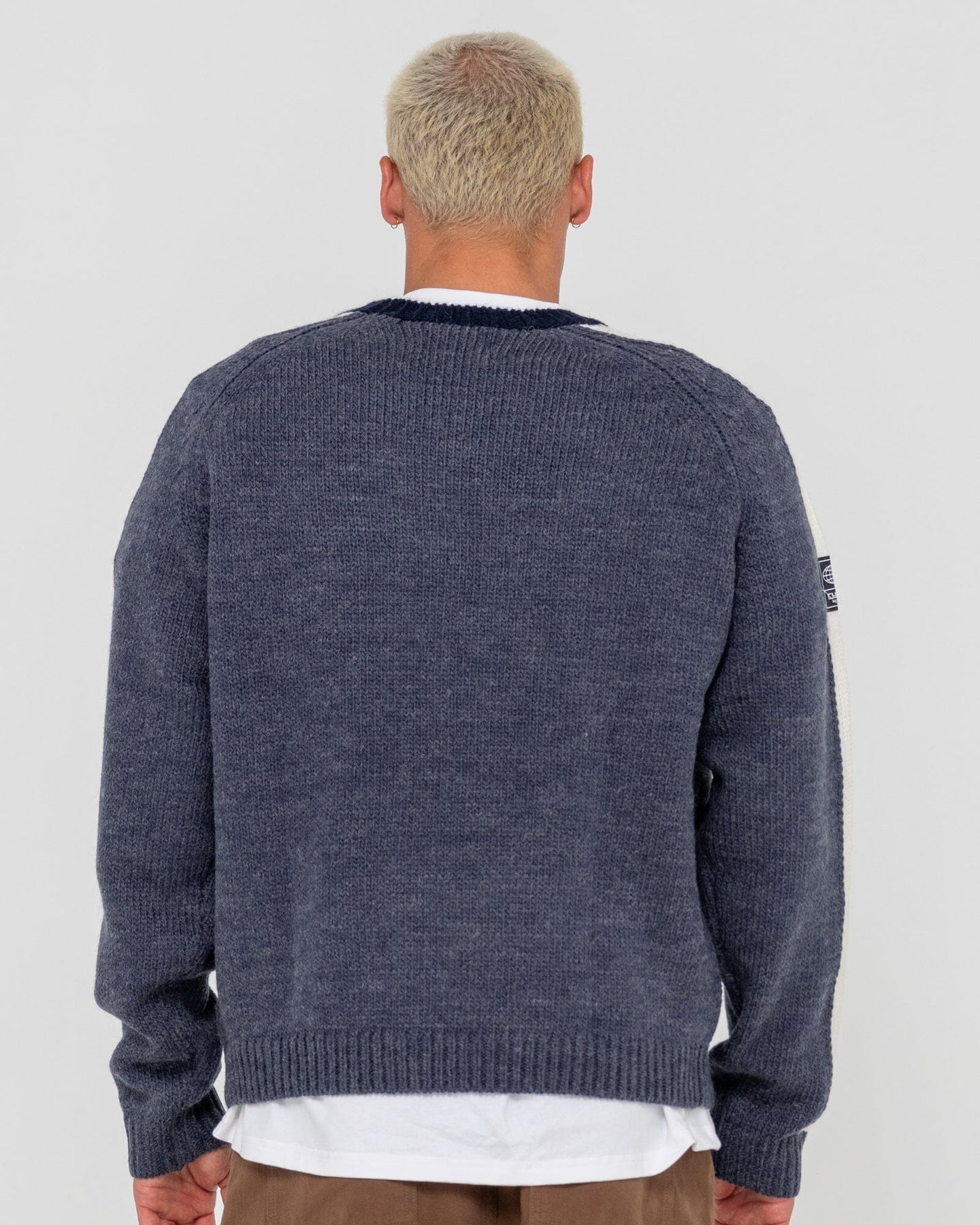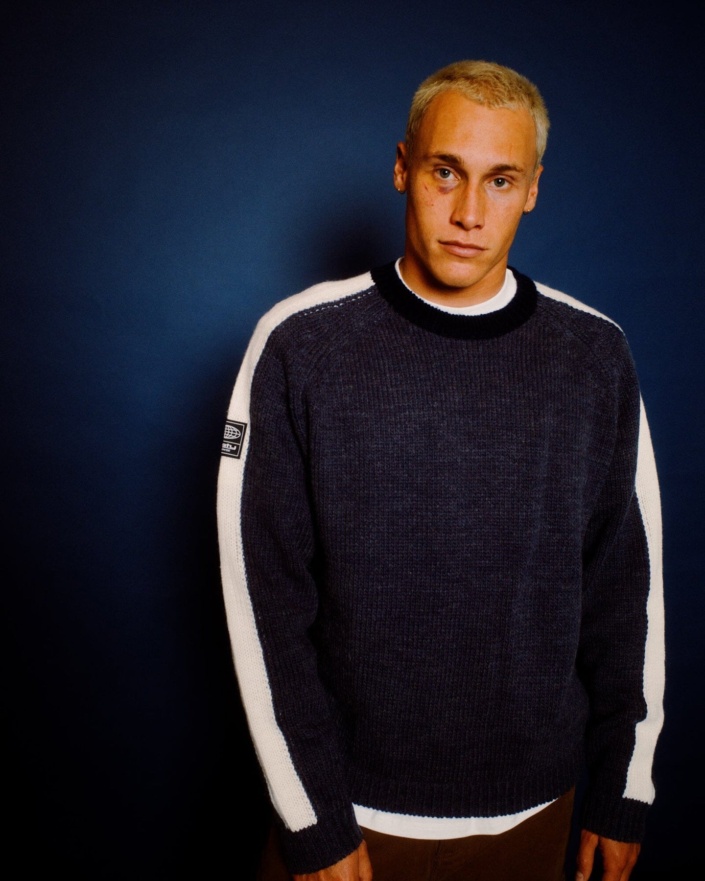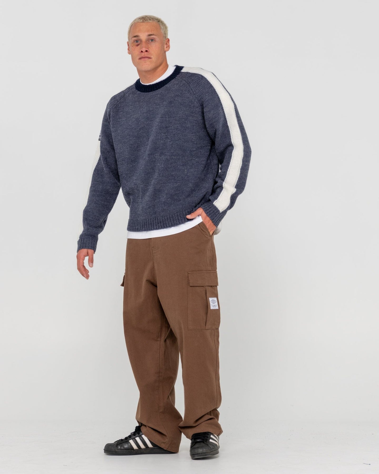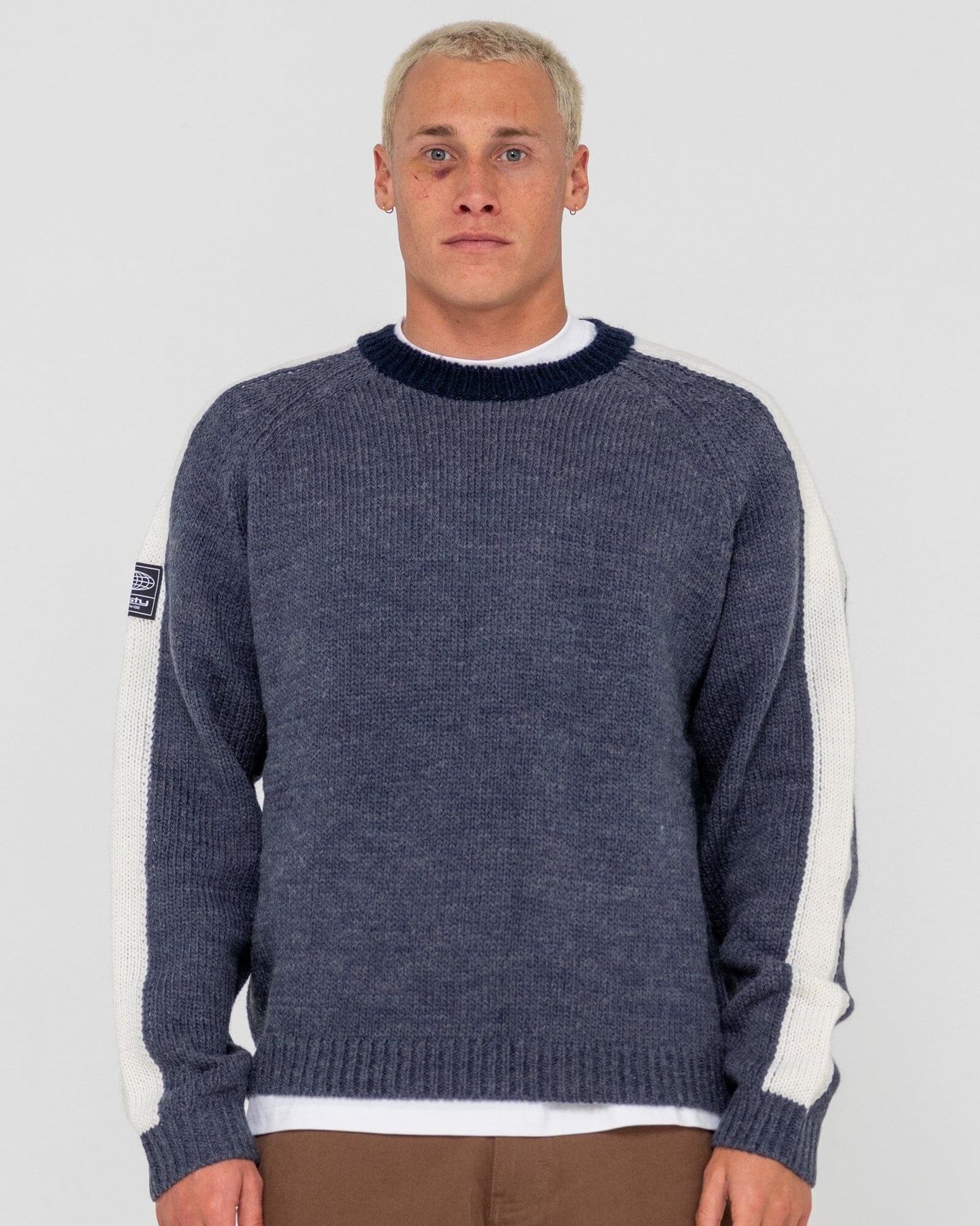 R2k Boxy Fit Crew Neck Chunky Knit With Contrast O/arm Stripe And Rusty Exterior Patch. 80% Acrylic / 20% Wool Blended Knit