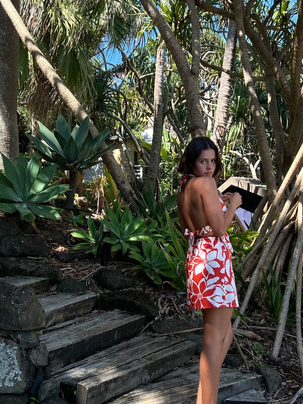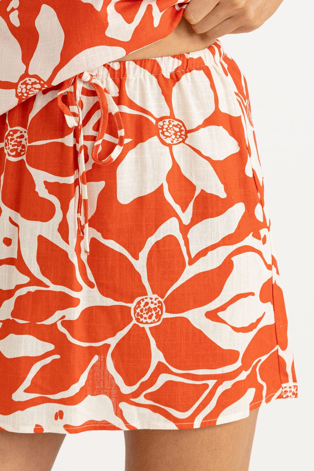 This high-waisted bias-cut mini skirt offers a flattering fit with an elastic waistband and drawstring closure at the center front. Perfect for pairing with swimwear or casual tops.