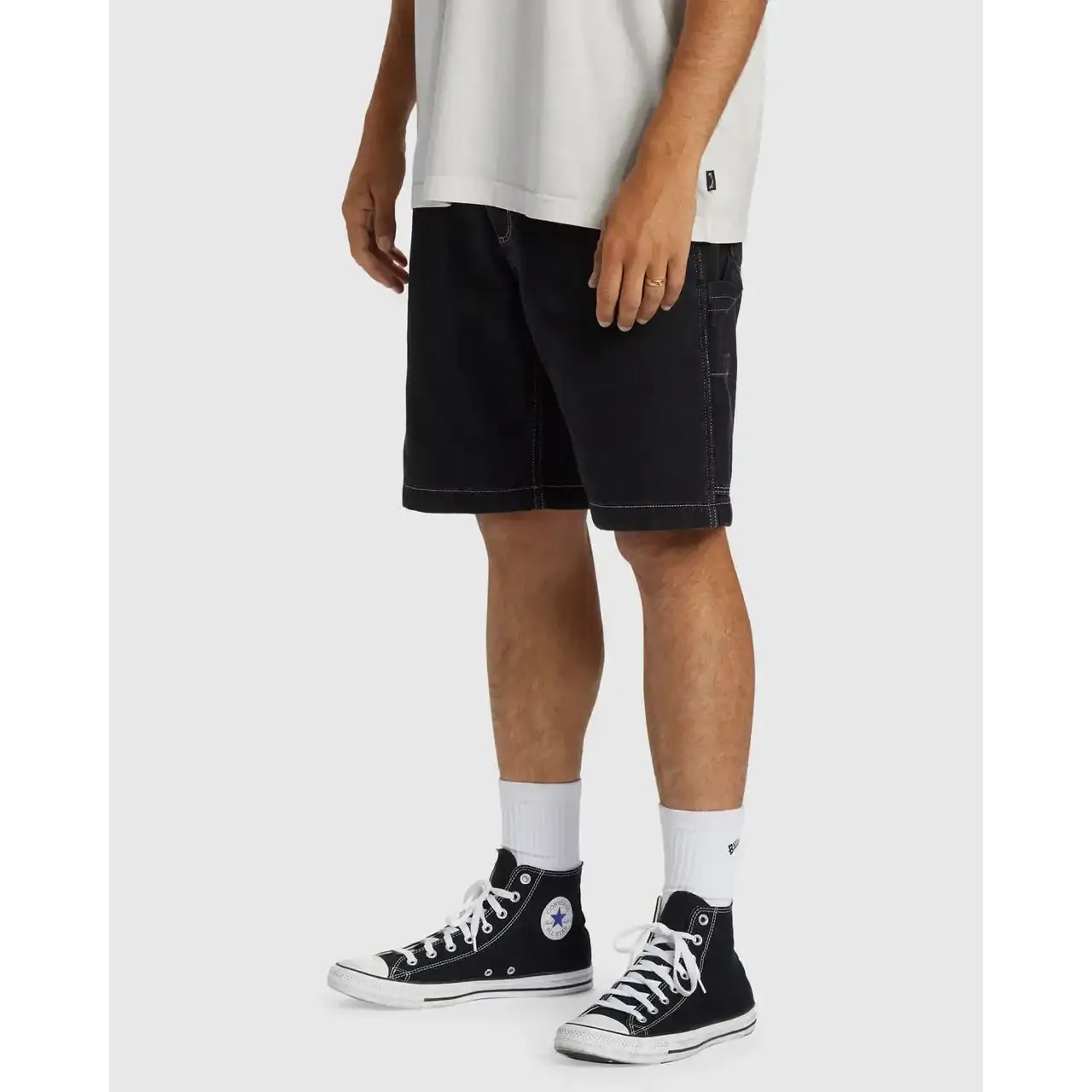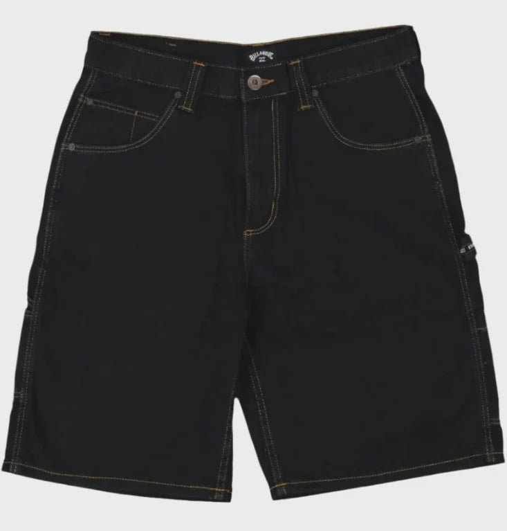 The Billabong Bad Dog Denim Walk Shorts are crafted from heavyweight 13.5oz cotton denim with a long stone enzyme wash for a vintage, worn-in appeal. Featuring a relaxed, straight fit and a fixed waist with button closure and zip fly, they provide comfort and durability for work or casual wear. Equipped with multiple utility-style pockets including tool, coin, dual front pockets, and large patch back pockets with an added dual pocket on the back right, these shorts blend function with style. Finished with contrast stitching, metal rivets, bartack reinforcements, and a Billabong patch for authentic workwear aesthetics.