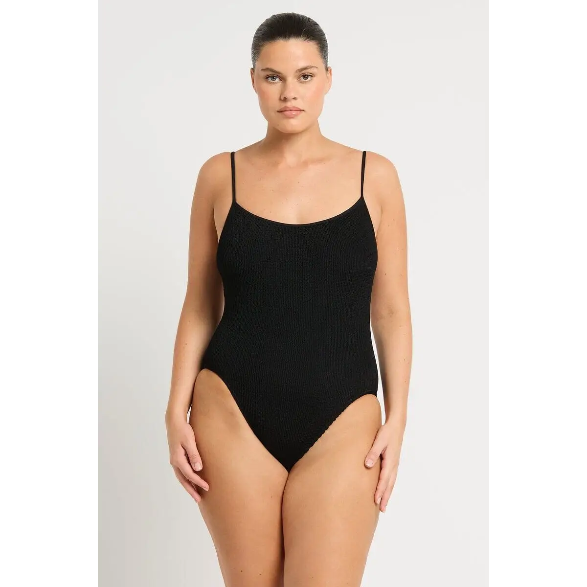 The Bond-Eye Low Palace One Piece Swimsuit offers a forgiving crinkle fabric that stretches to suit most body types from dawn swims to beach hangs. Square neckline delivers reliable coverage while the low scoop back adds breathability and style. Adjustable straps ensure custom support across bust sizes, with cheeky to mid coverage that sits high or low on the hip. Quick-drying recycled blend holds shape through salt water and sun.