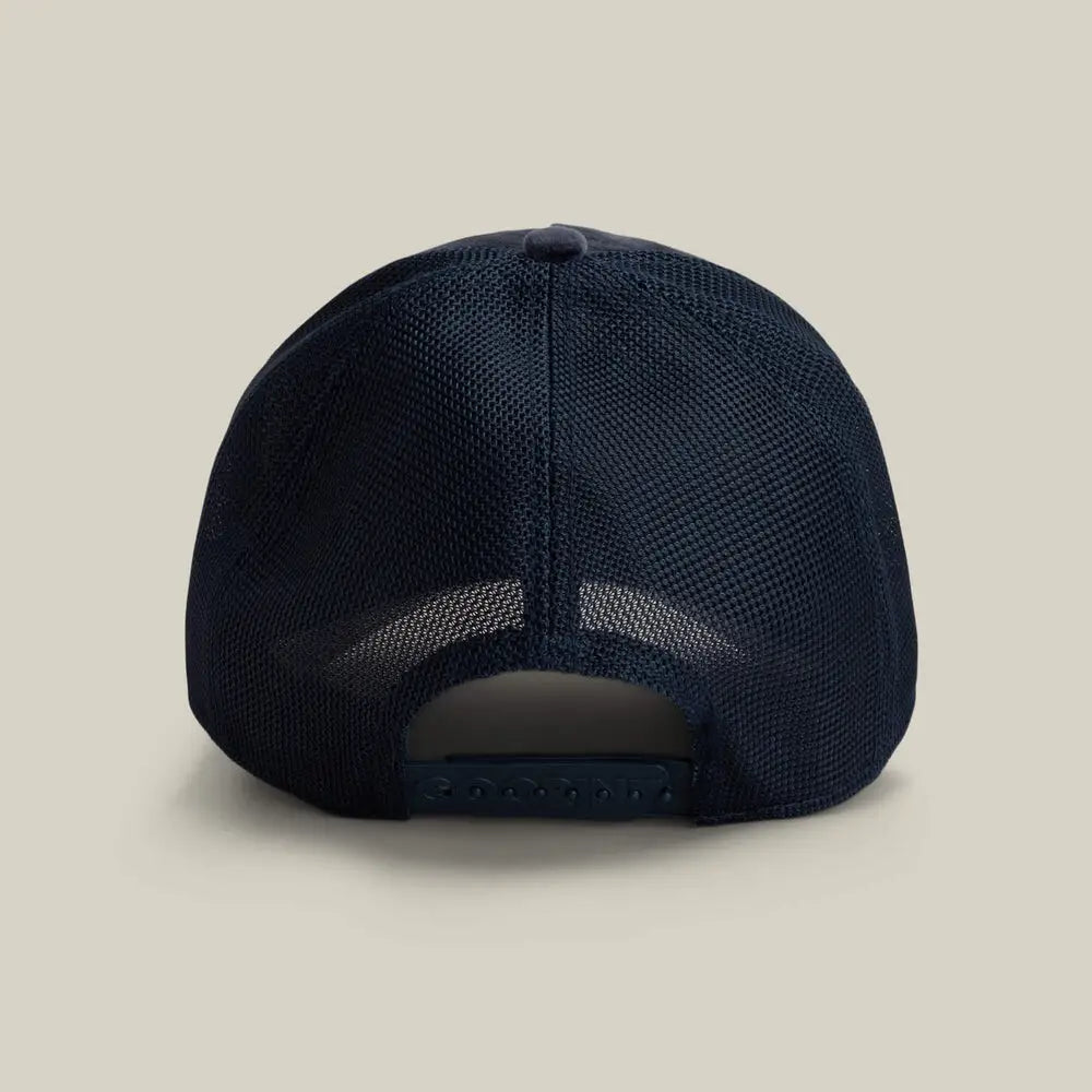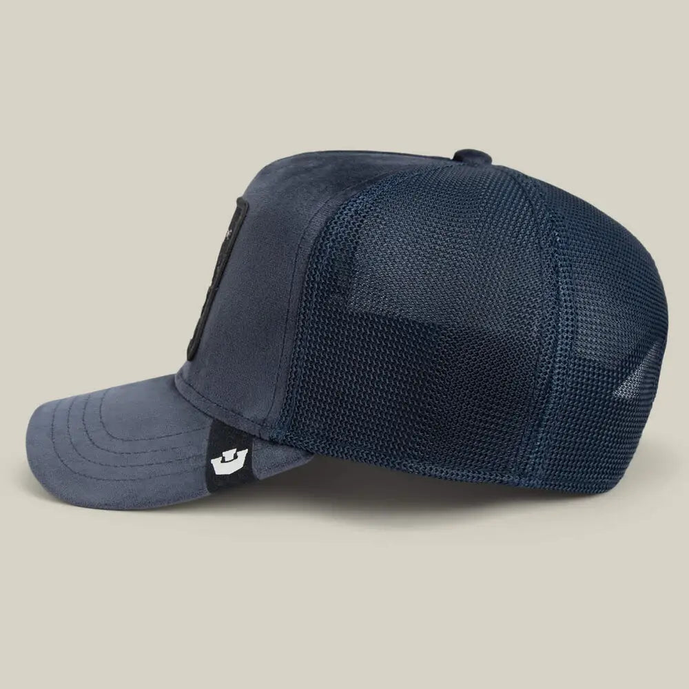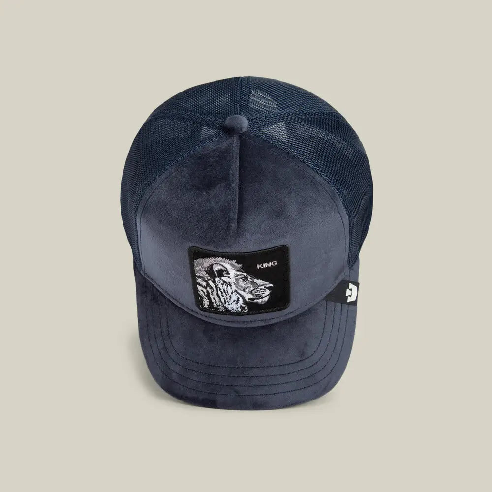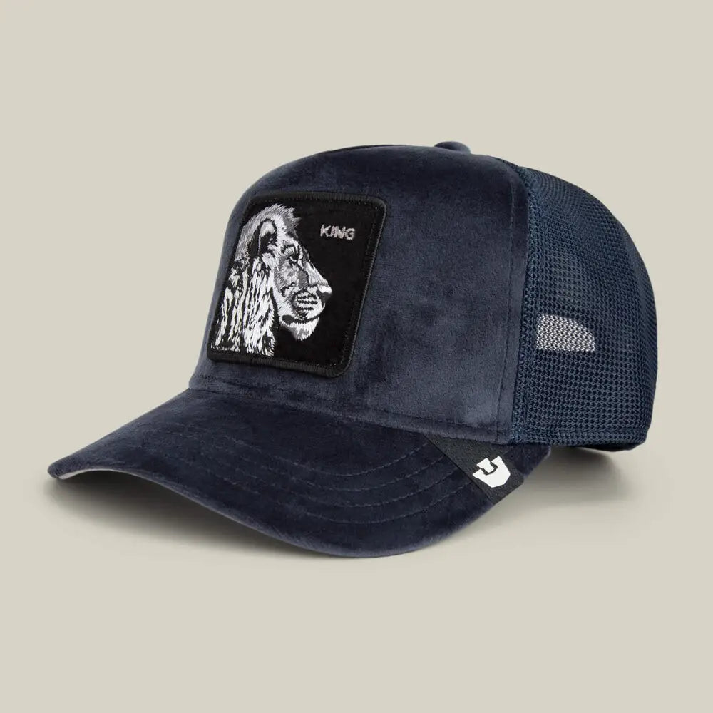 Regal velour trucker cap with lion patch for premium coastal swagger.