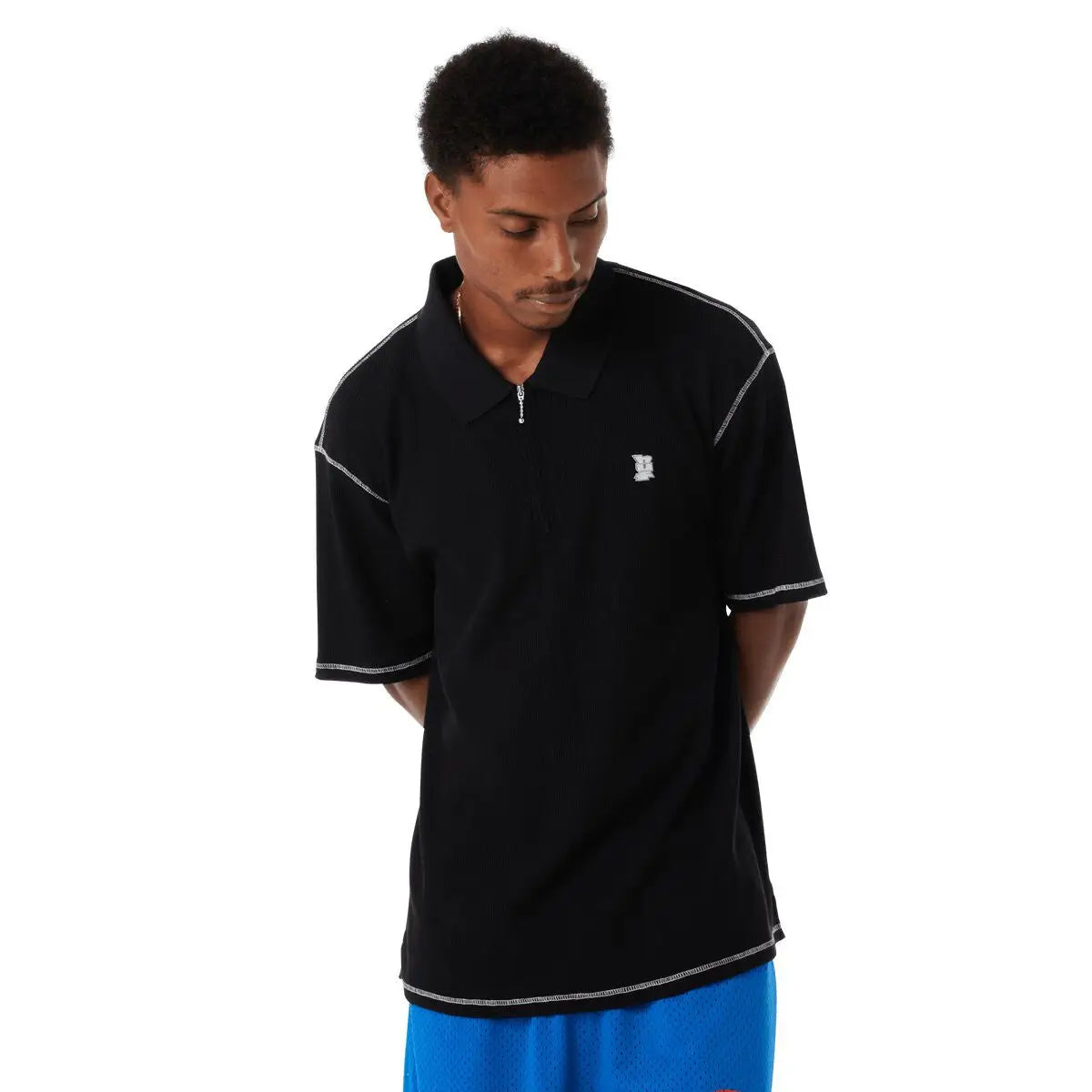 Built with a comfortable construction with just enough stretch, the Waffle Knit Contrast S/S Polo Top features a quarter zip closure, embroidered artwork, and contrast stick details.