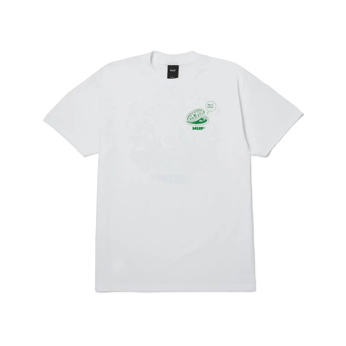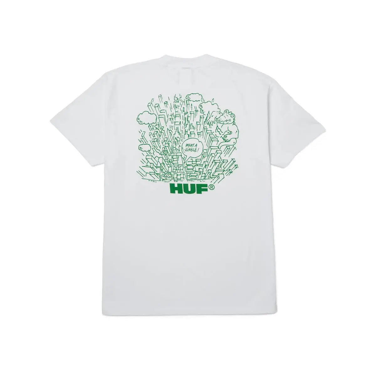 The HUF What a Jungle T-Shirt is crafted from 100% cotton with a midweight 6oz jersey fabric that balances comfort and durability. It has a regular fit that is neither too slim nor oversized, making it a versatile choice for everyday wear. The tee features screen printed artwork on the left chest and the back, creating a bold visual impact with its unique design. Finished with a ribbed crew neck and a woven HUF label at the interior neck, it gives off authentic streetwear vibes while delivering breathable comfort.