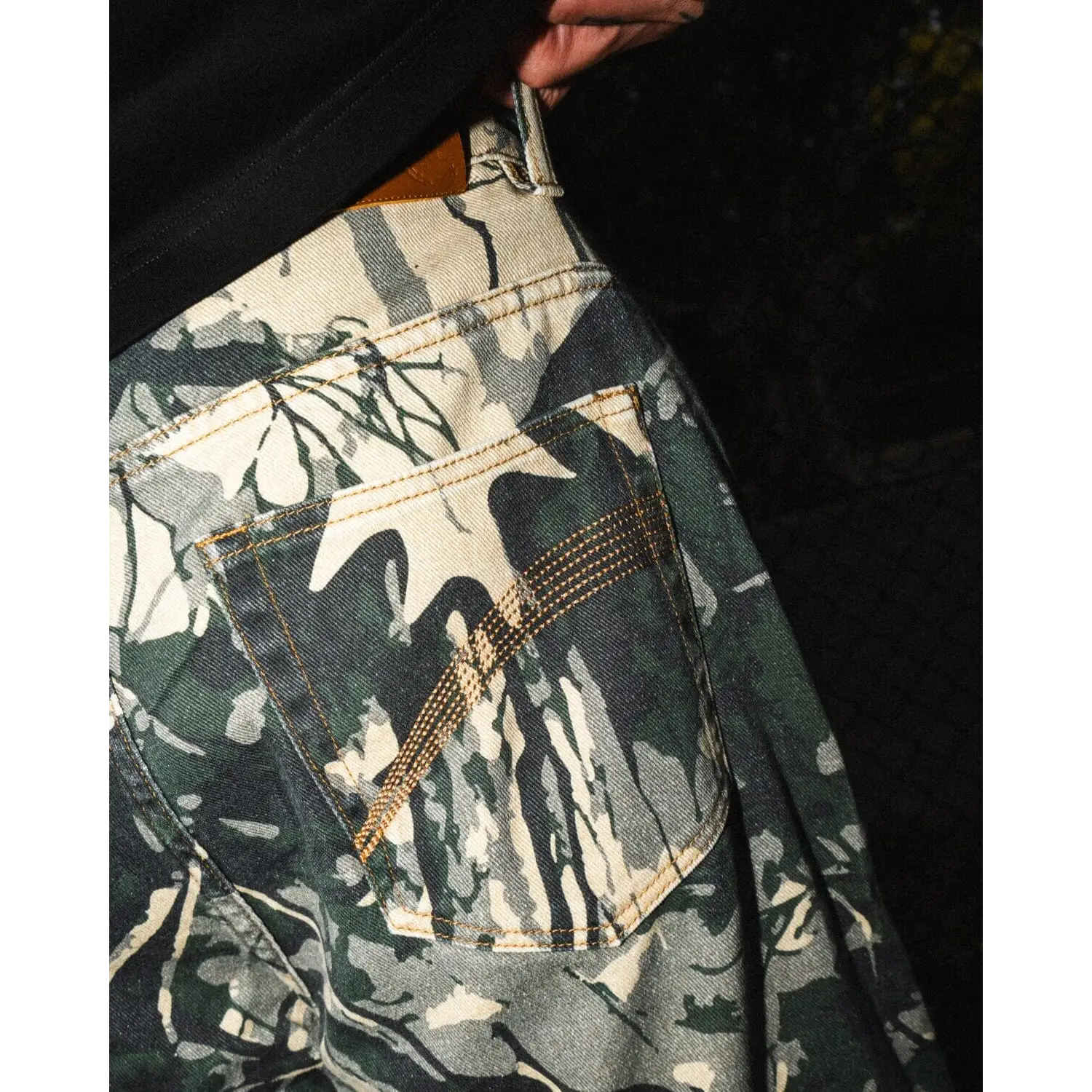 - Branded leather badge at coin pocket and back waistband for authentic styling