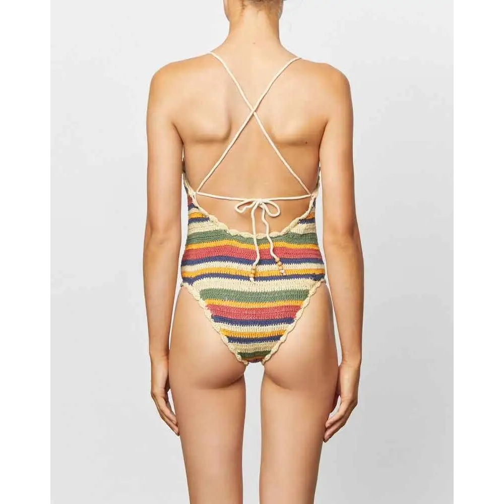 This one piece is artisanally made from 100% cotton in beautiful hand crochet. Featuring our earthy colour palette Tahoma stripe with wooden beads on the ties.