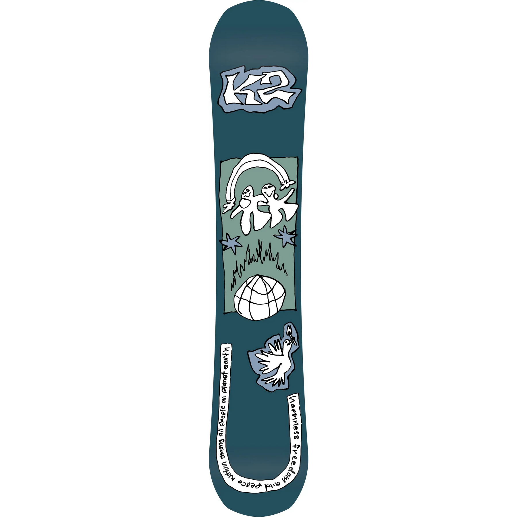 Graphically, we worked with K2 Snowboarding Staff Photographer Marc O’Malley to help bring the World Peace some new energy for 2024. A bright, poppy base makes it so that your tricks catch people's attention in the park, and a clean top sheet is the perfect canvas for stickers and maybe even a little bit of illustration yourself.