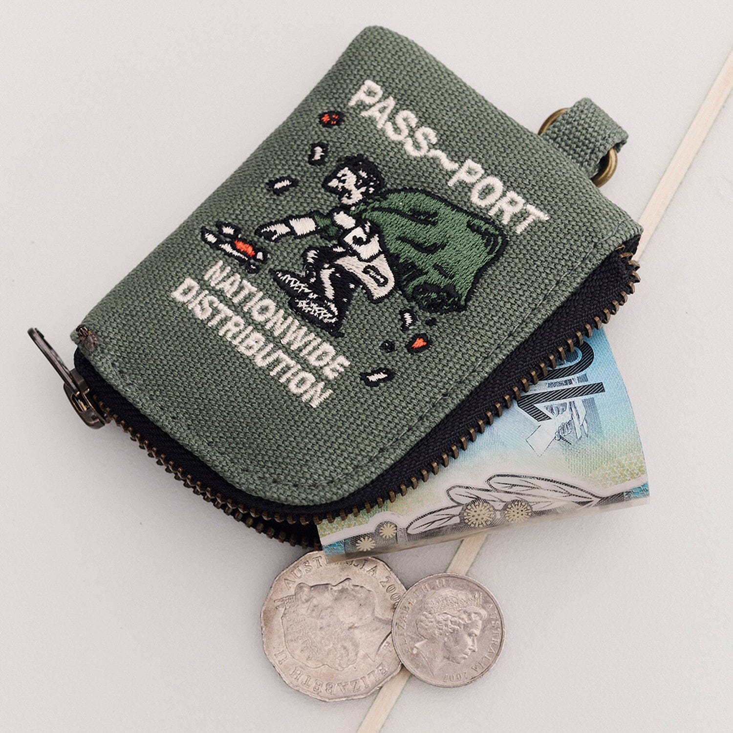 The Passport Distribution Coin Pouch keeps your change organised and accessible during skate missions or Wānaka adventures. Crafted from heavy-duty canvas with bold embroidery on front and back, it features a smooth YKK zipper for secure closure and a metal D-ring for easy attachment to keys or bags. Slim profile slips into pockets without bulk, perfect for riders grabbing vending machine fuel between sessions or stashing locker keys.