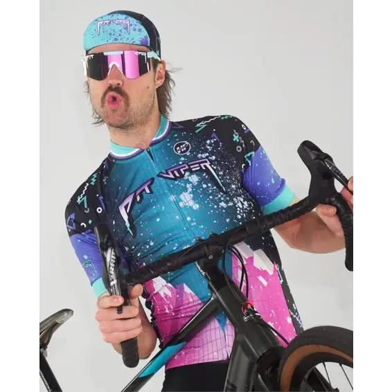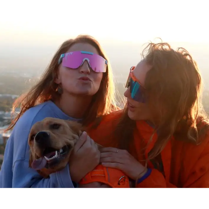 1. A Pit Viper with a pink on blue splattered frame, white accents, and a pink mirror lens.