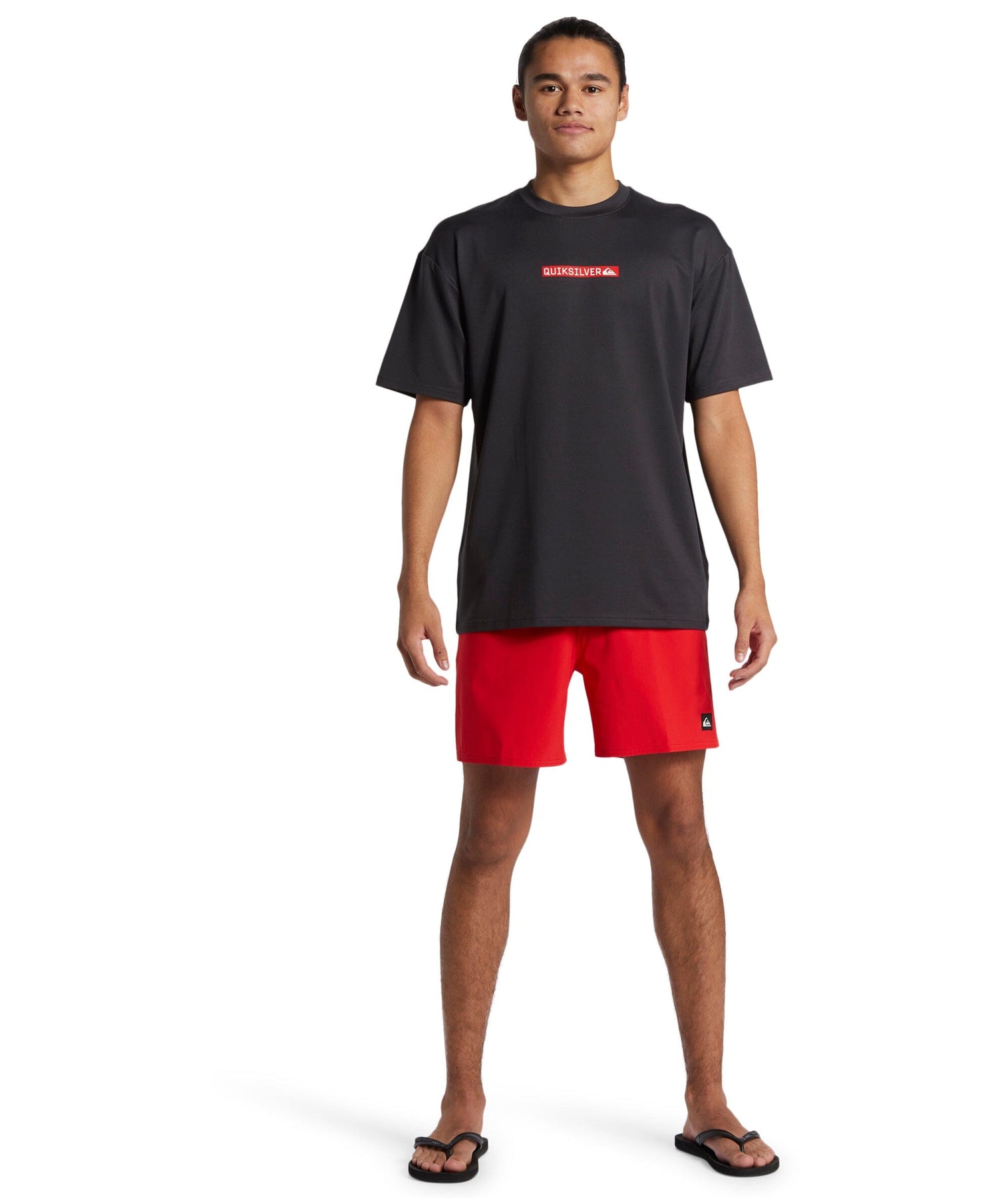 Solution dyed in a black wash, this DNA Clicker Logo short-sleeve rashguard from Quiksilver is designed to keep you looking good and feeling great both in the waves and on the sand. This loose-fit surf top is made of partially recycled polyester that feels as soft as cotton but takes it a step further with engineered stretch, ultra-strong sun protection, and moisture-wicking performance. Featured here in the Tarmac colorway.