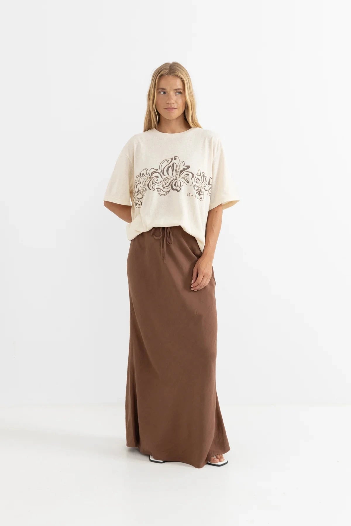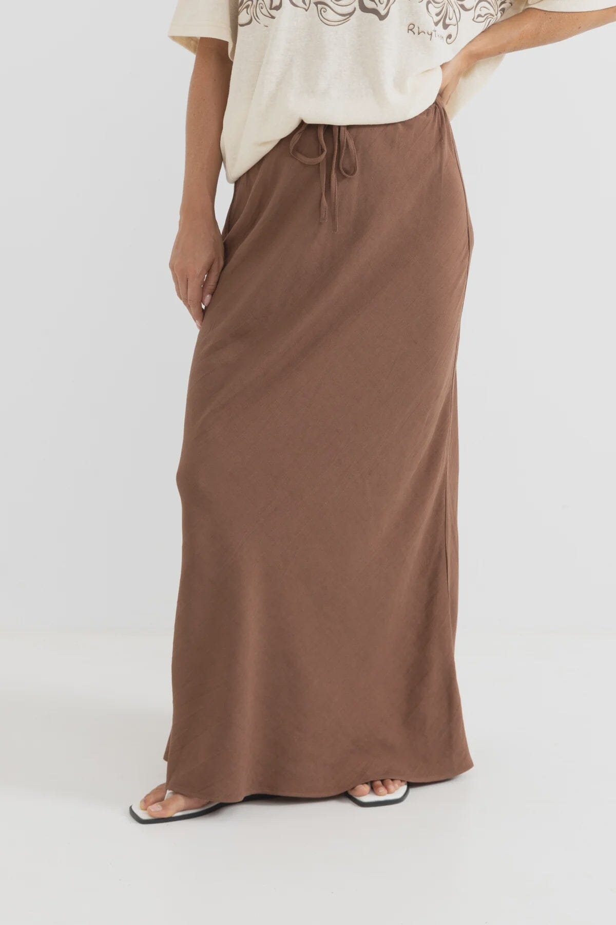 Rhythm Nadia Bias Cut Maxi Skirt in Chocolate offers flowy, timeless summer style.