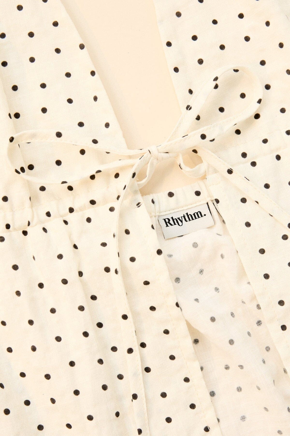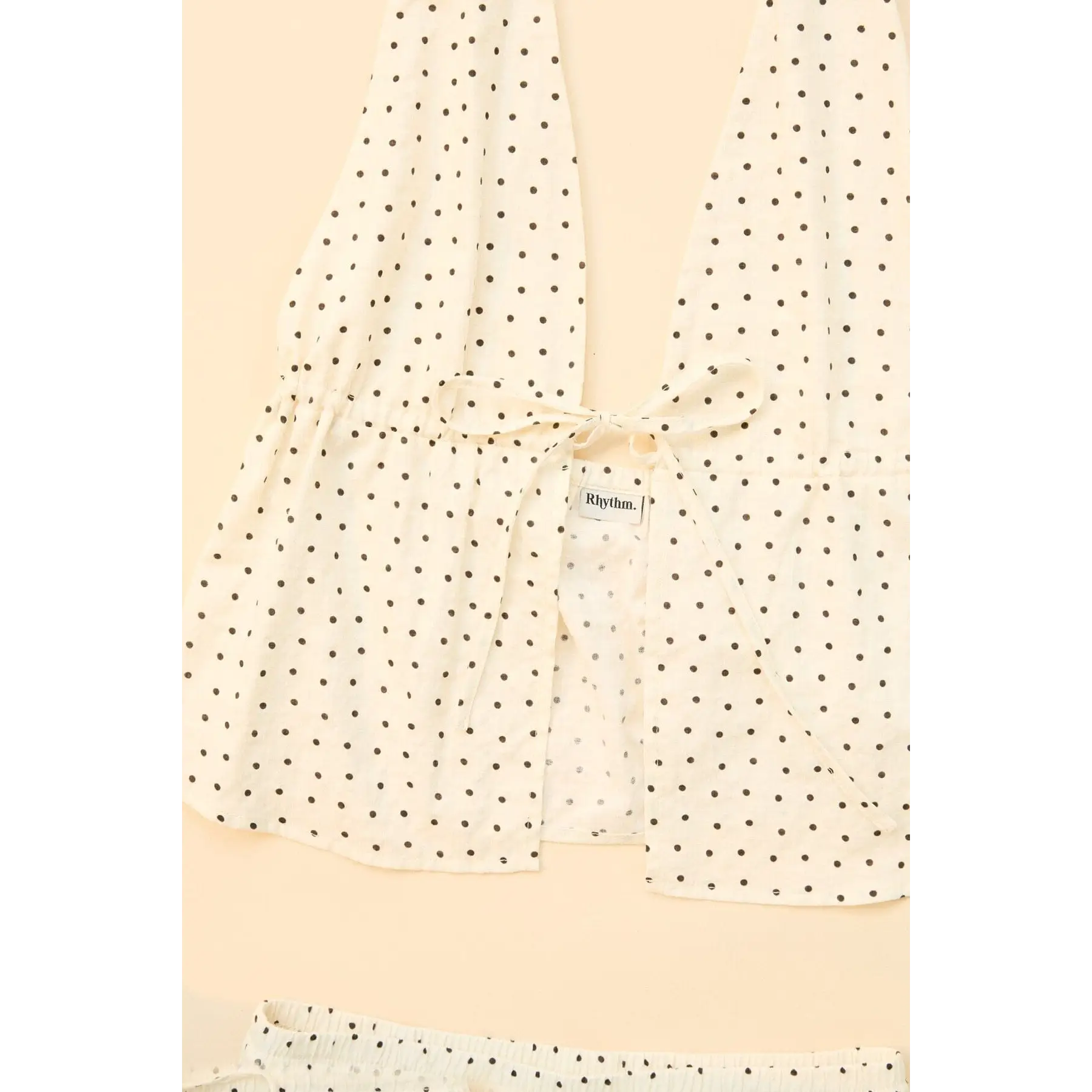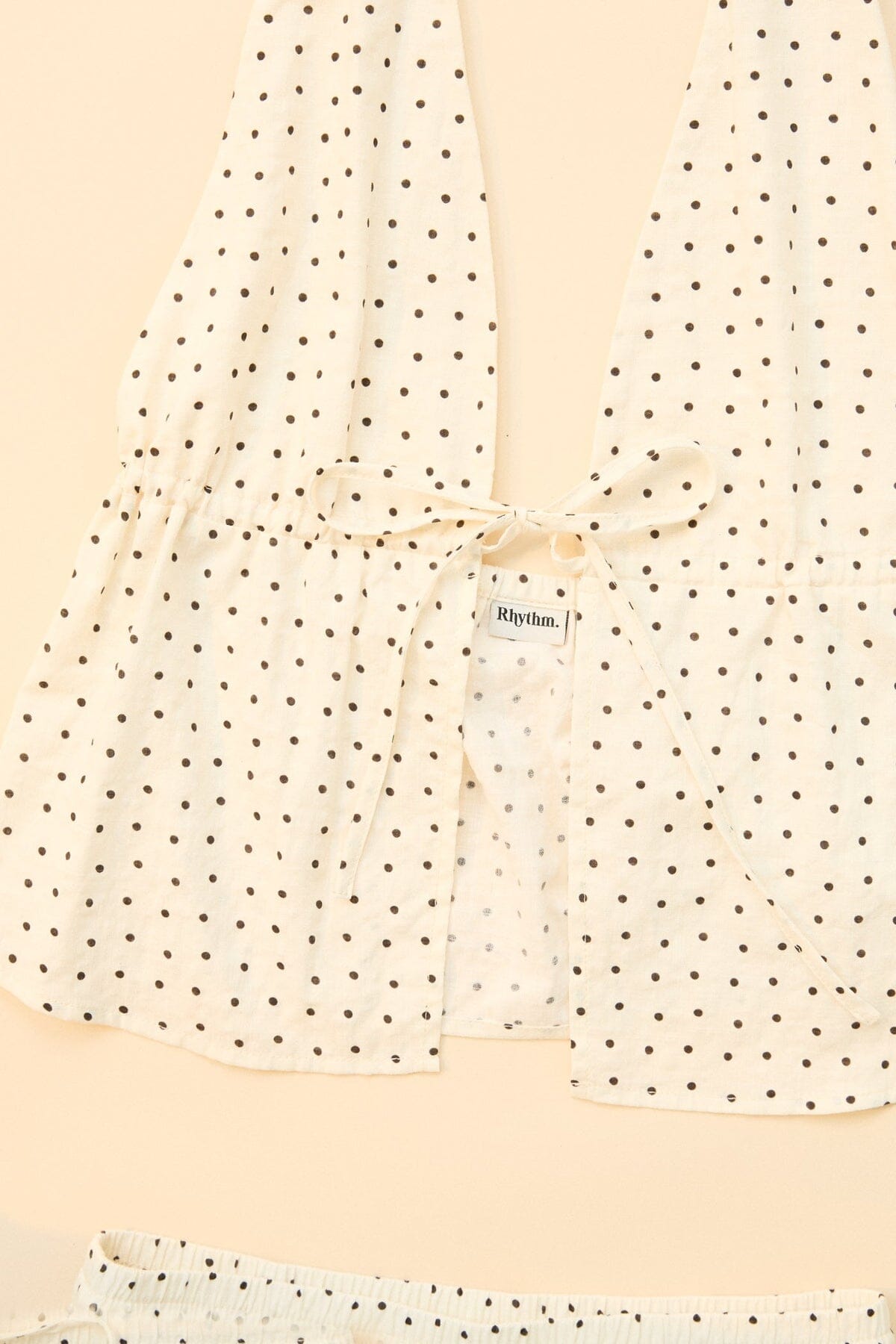 The Rhythm Polka Halter Top delivers medium-to-full support through active swims or sun sessions, wrapping comfortably around the neck for all-day hold. Adjustable halter strap and tie-back allow custom fit without pressure points, while underbust elastic adds stability for confident movement. Open back design keeps it breezy, paired with quick-dry stretch fabric that sheds water fast. Perfect for waves or lounging when you need style that stays put.