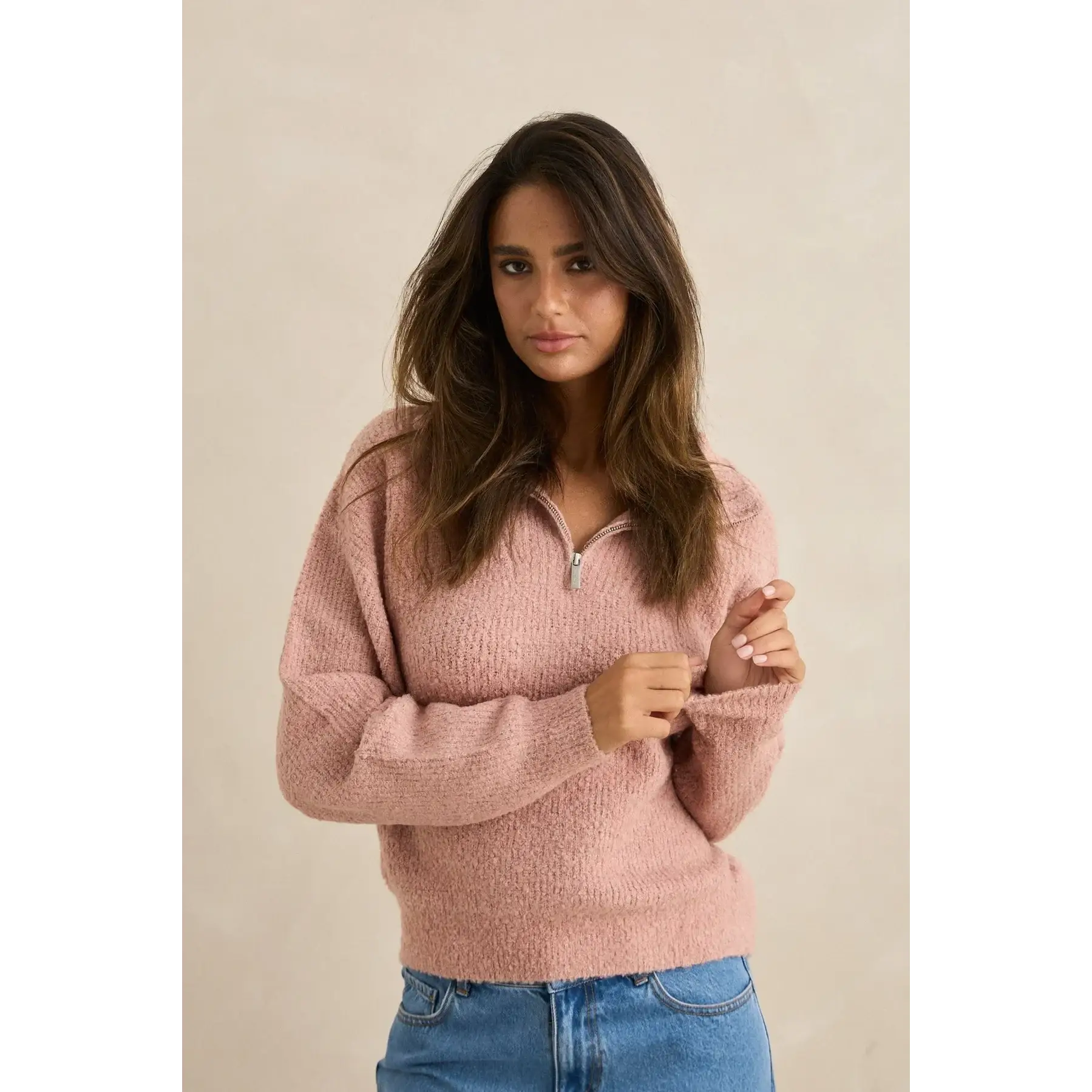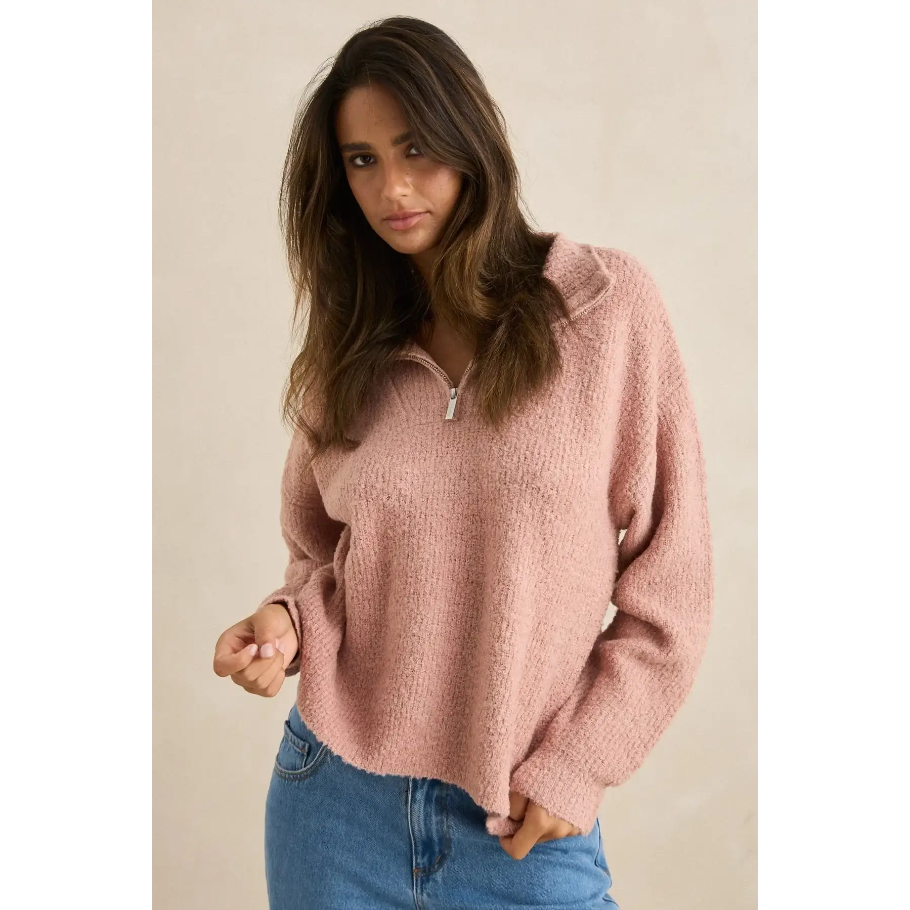 Cropped quarter zip knit with soft boucle texture for coastal layering.