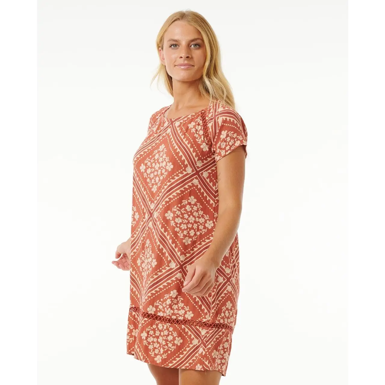 Book that holiday, the Soleil Shift Dress is the excuse you've been waiting for. Throw this relaxed fit mini on and enjoy some extra coverage on the way to your sunrise swim to dusk soiree. The contrasting all over yardage print in Rust and Black will pair perfectly with your wardrobe and suitcase essentials.