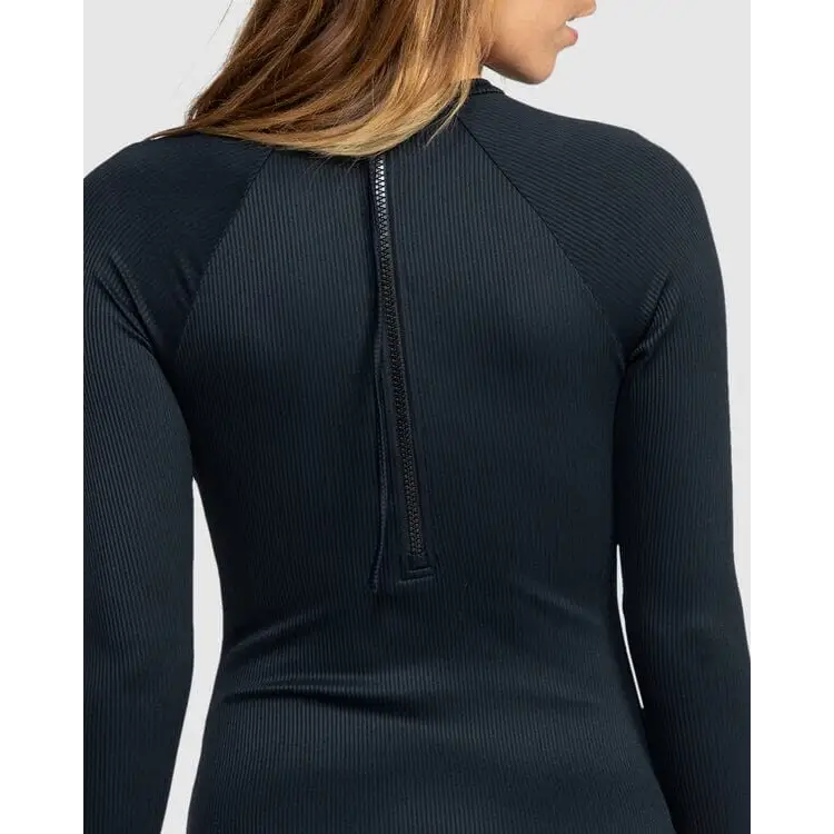 The Roxy Rib Roxy Love Long Sleeve Rash One Piece Swimsuit features a soft, strong recycled nylon elastane blend with a textured ribbed finish that offers excellent stretch and durability. Designed with an elongated shape to flatter the feminine form, it includes a secure underbust line for added coverage and support. Seamless construction complements curves with a smooth fit, while flatlock ZZ stitches inside enhance comfort and reduce chafing. Perfect for active water days, this swimsuit balances function and fashion for confident performance.