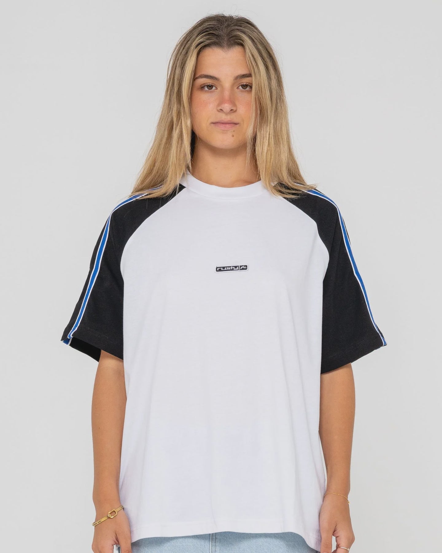 The Rusty Crank Panelled Oversize T-Shirt is crafted from 100% cotton midweight jersey, delivering breathable and soft comfort for all-day wear. This shirt features contrasting panelled sleeves and a bold front marrow badge, giving it a sporty and modern look. The oversized fit offers a relaxed silhouette suited for casual, laid-back style with authentic Rusty surf vibes. Ideal for riders and streetwear fans wanting an effortless tee that stands out with subtle details.