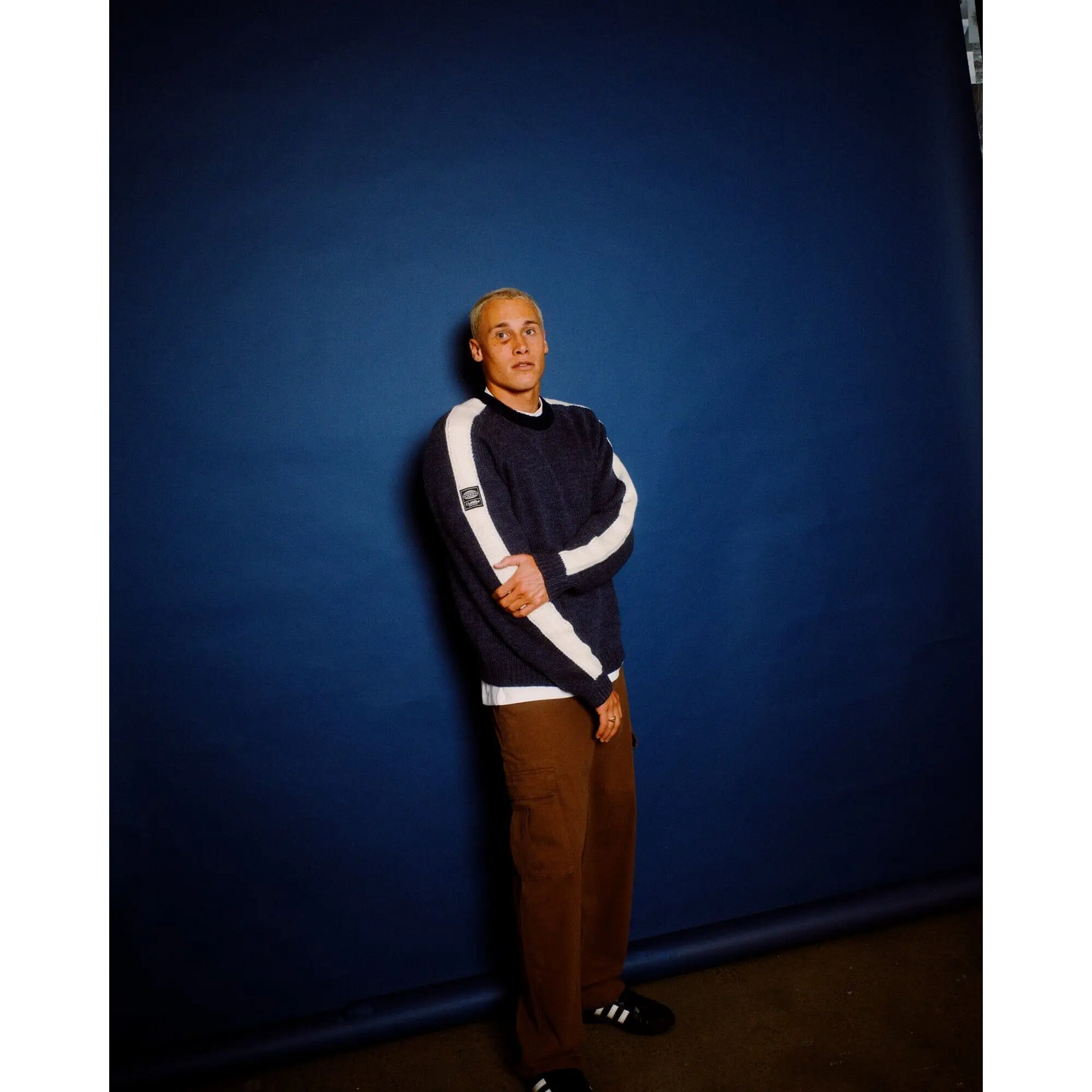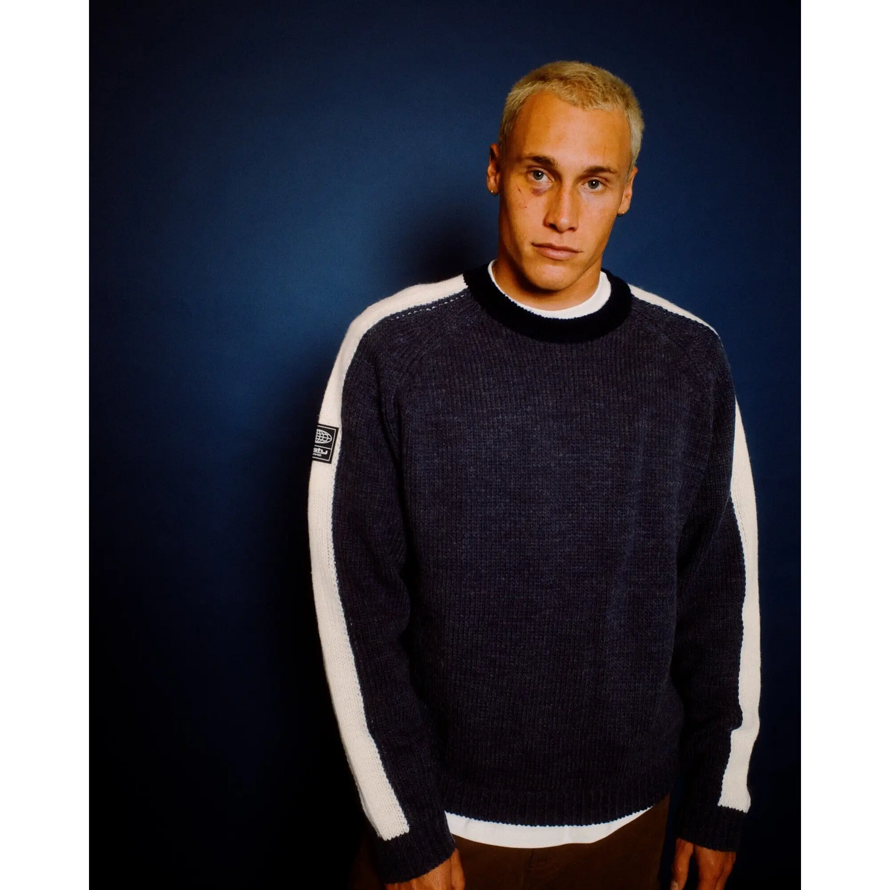 R2k Boxy Fit Crew Neck Chunky Knit With Contrast O/arm Stripe And Rusty Exterior Patch. 80% Acrylic / 20% Wool Blended Knit