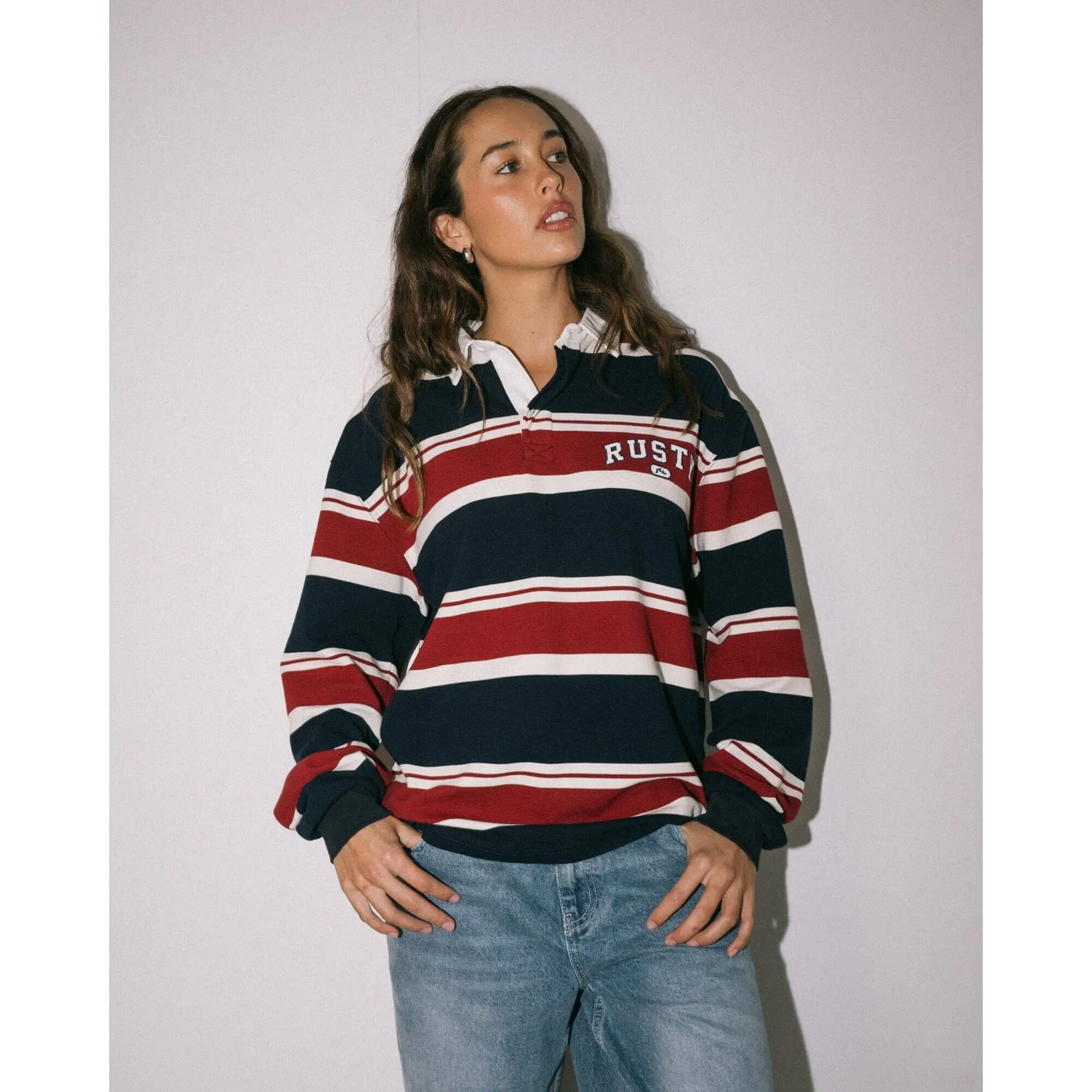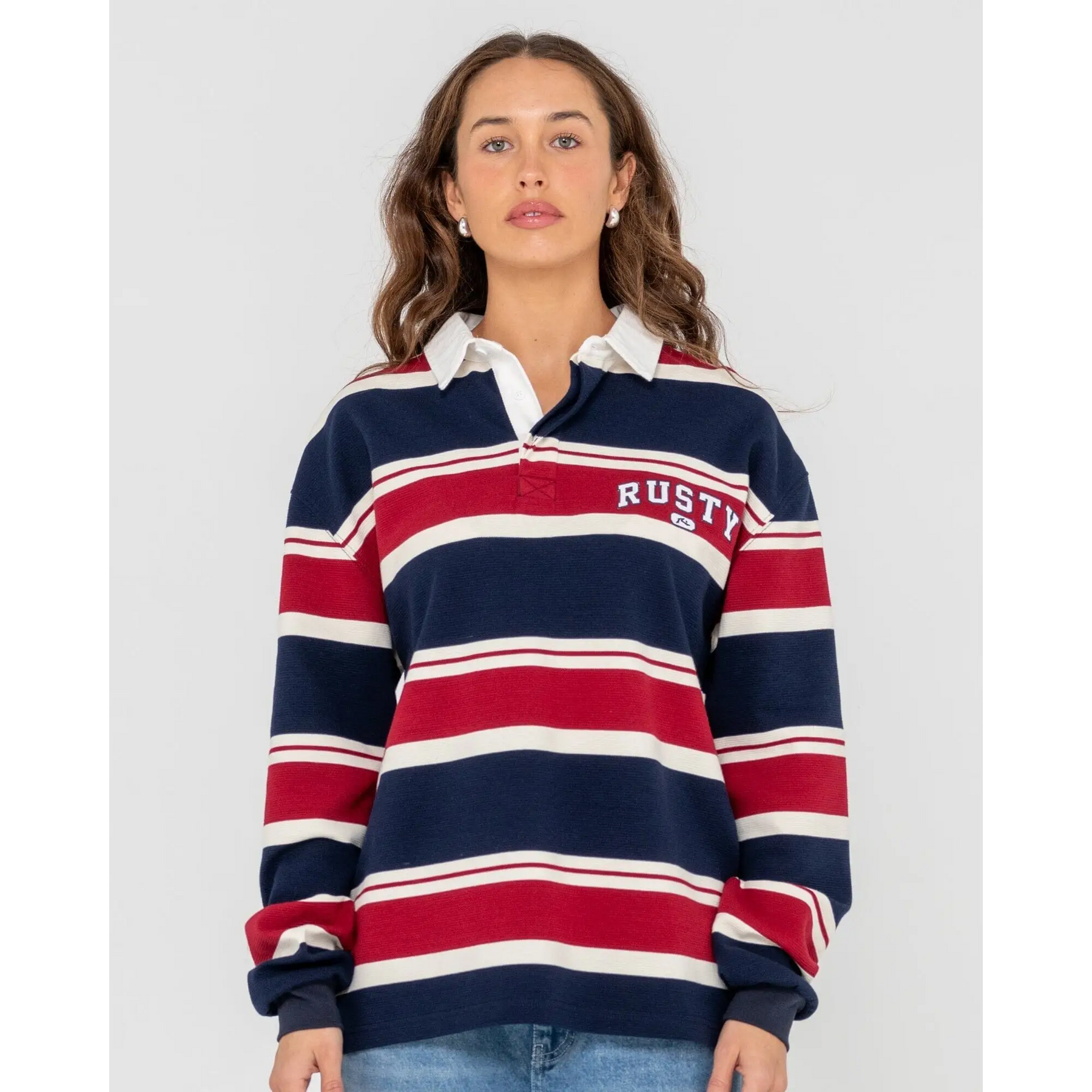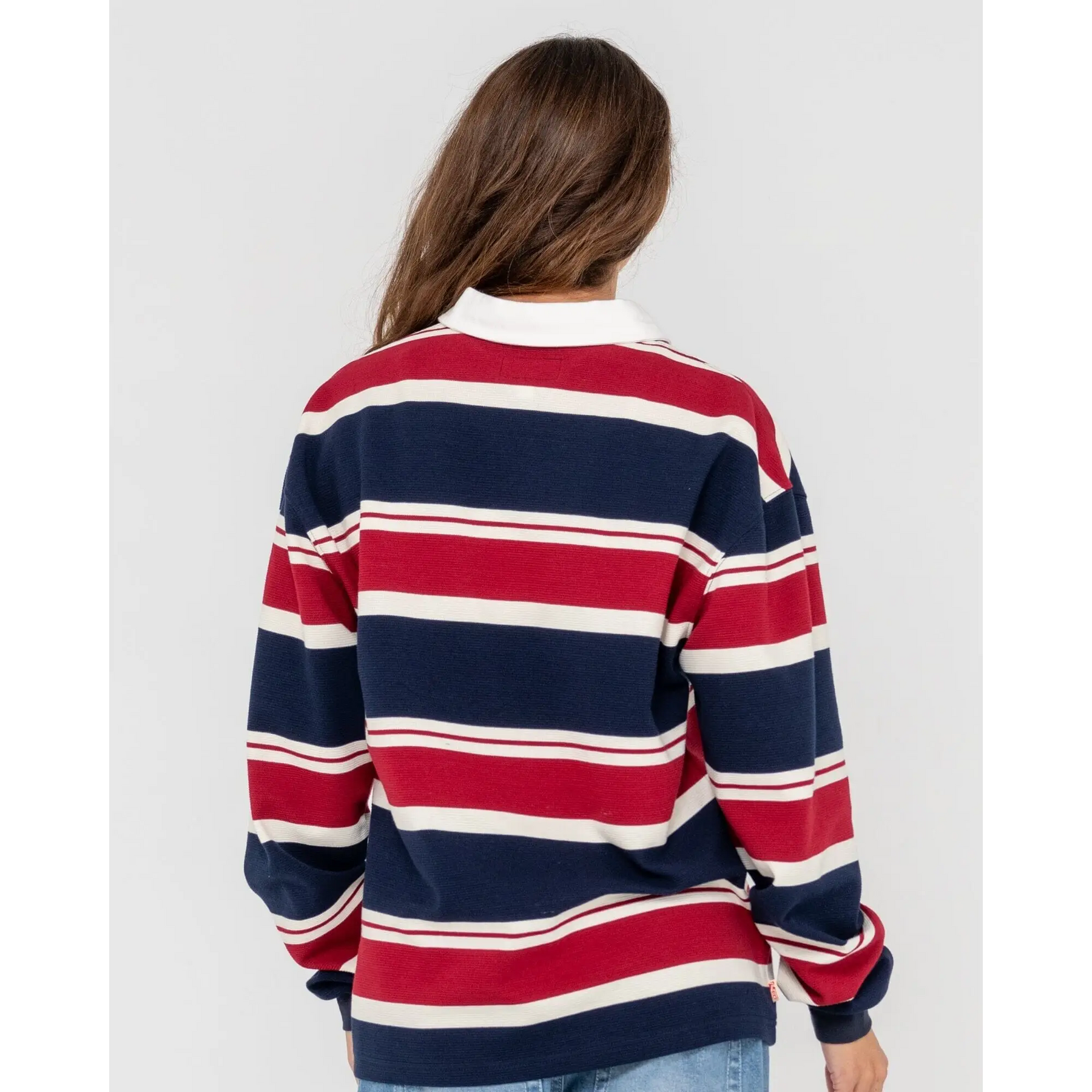 Oversized Long Sleeve Jersey With Contrast Twill Collar And Chest Embroidery. 65% Polyester / 30% Cotton / 5% Spandex