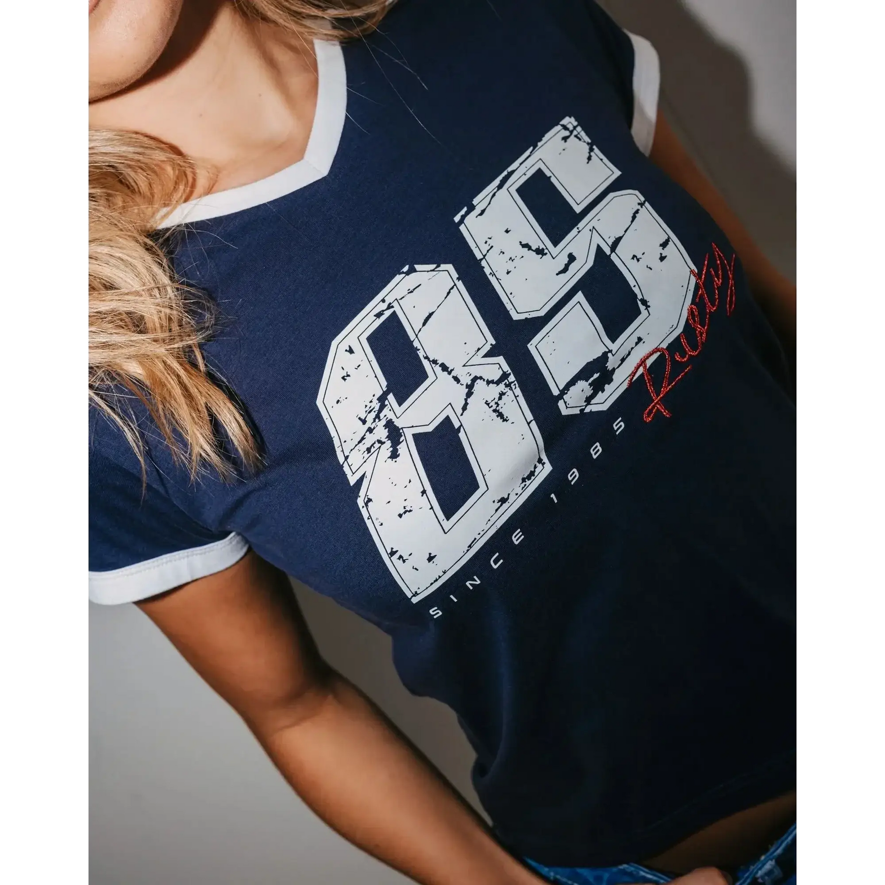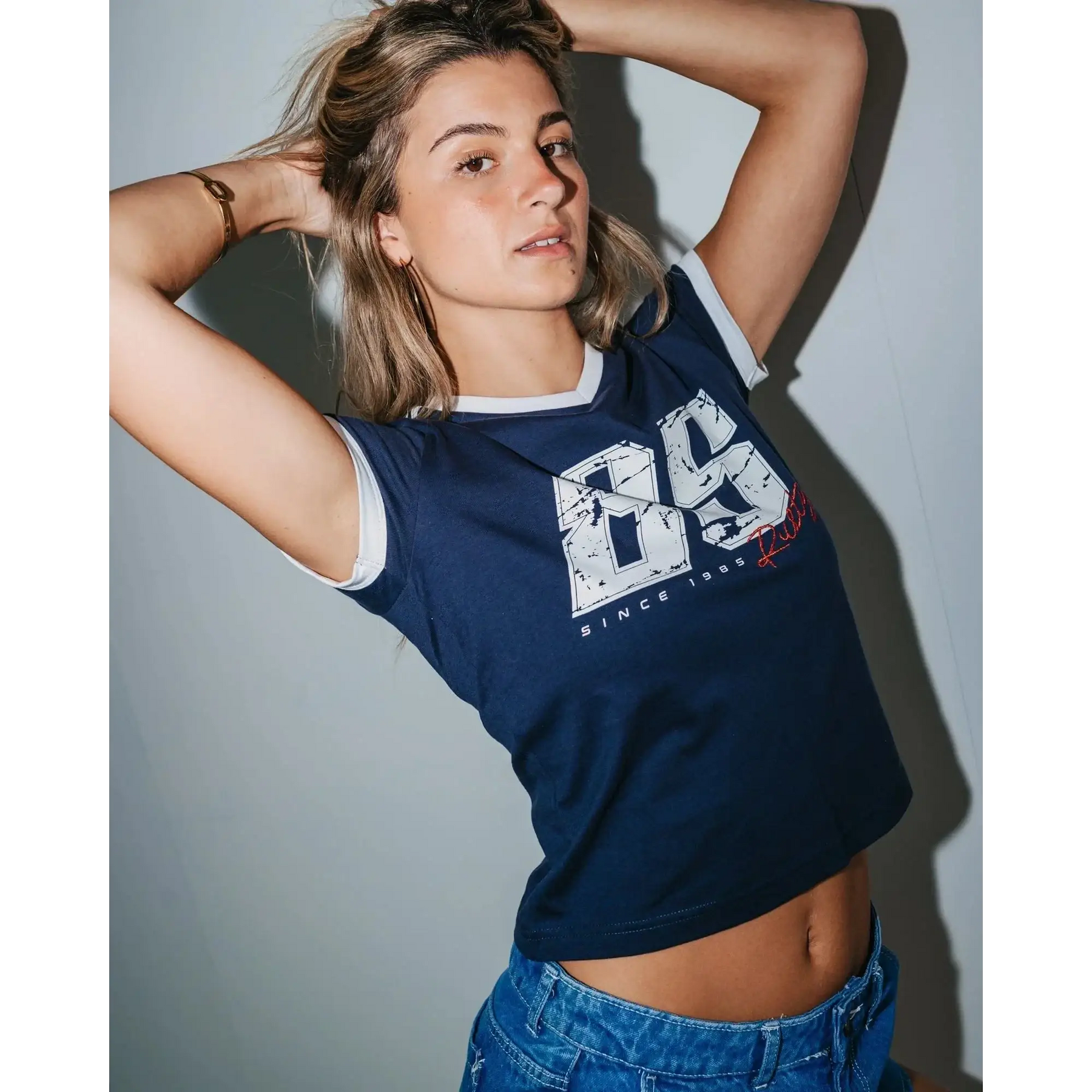 The Rusty Le Sports Jersey Baby T-Shirt features a comfortable midweight 100% cotton jersey fabric with contrast ringer neckline and sleeve hems for a vintage sporty look. This baby tee fits true to size with a close, flattering cut, making it perfect for casual wear or layering. The front showcases a subtle Rusty graphic, blending heritage style with everyday comfort for riders who want an easygoing, authentic tee that stands up to daily wear.