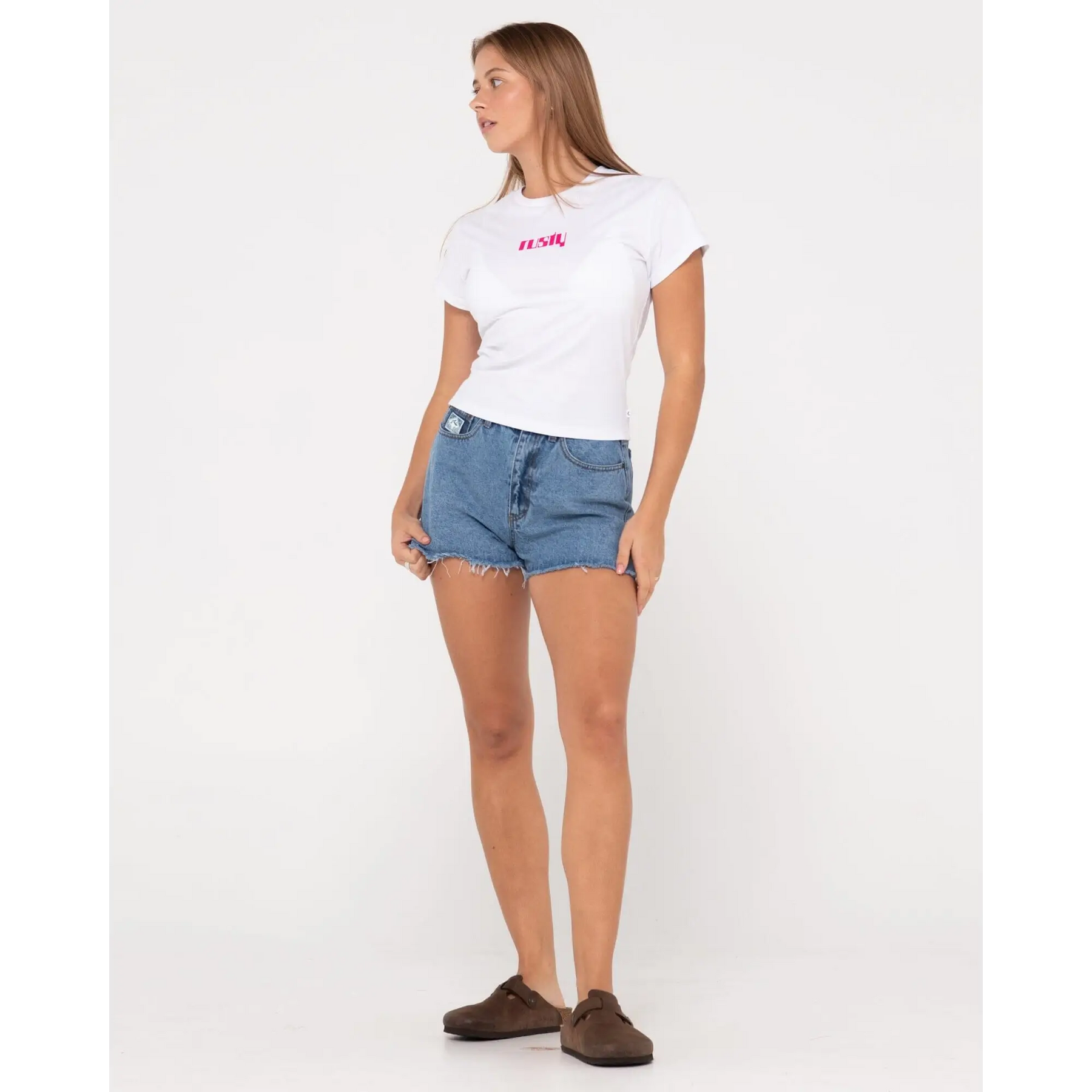 Short Sleeve Slim Fit Skimmer Baby Tee With Front Screen Print. Material: 100% Cotton Jersey