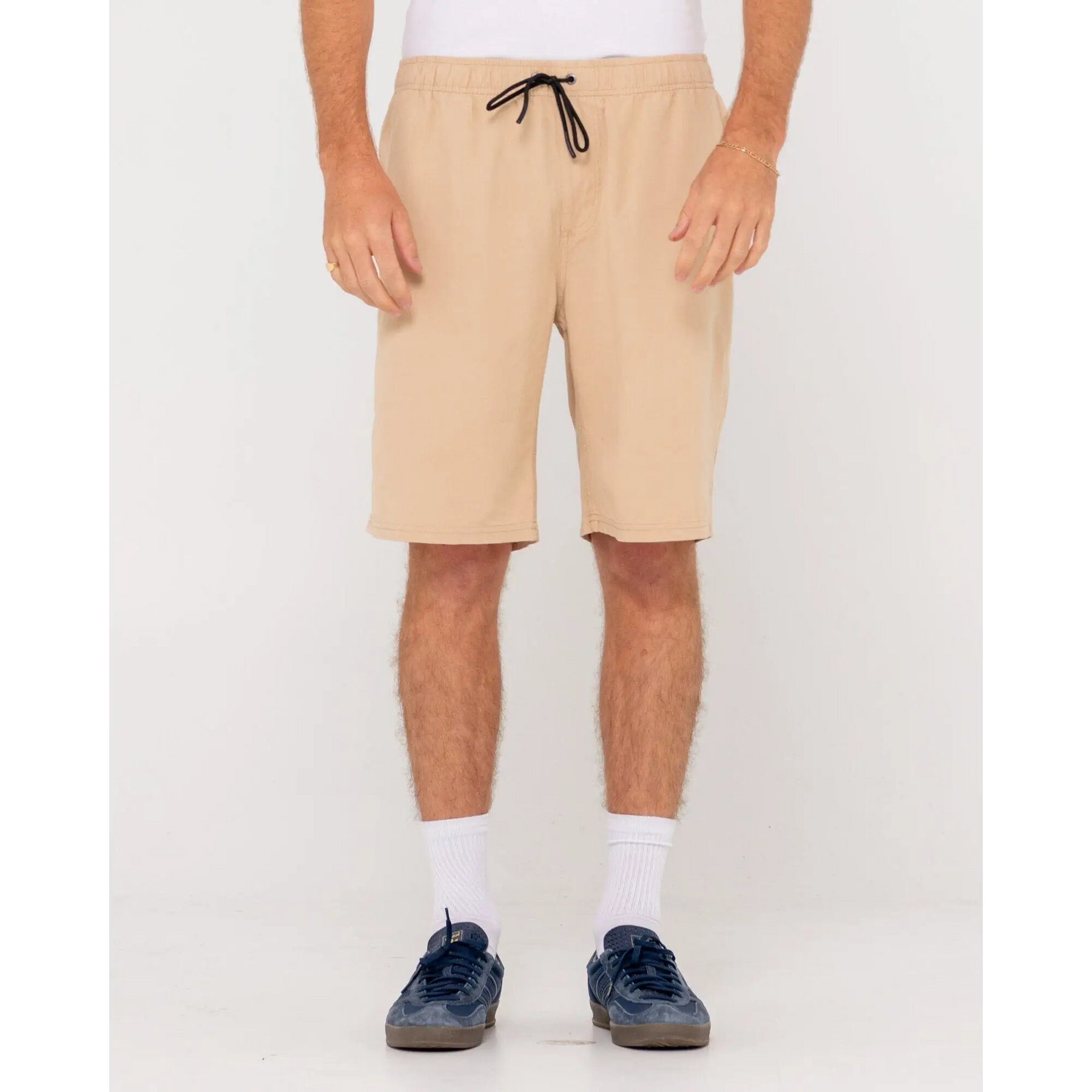 Straight Fit Elastic Waist Walkshort With A 20 Inch Outseam And Silicon Wash. Material: Rayon / Linen Blend - 70% Rayon 30% Linen