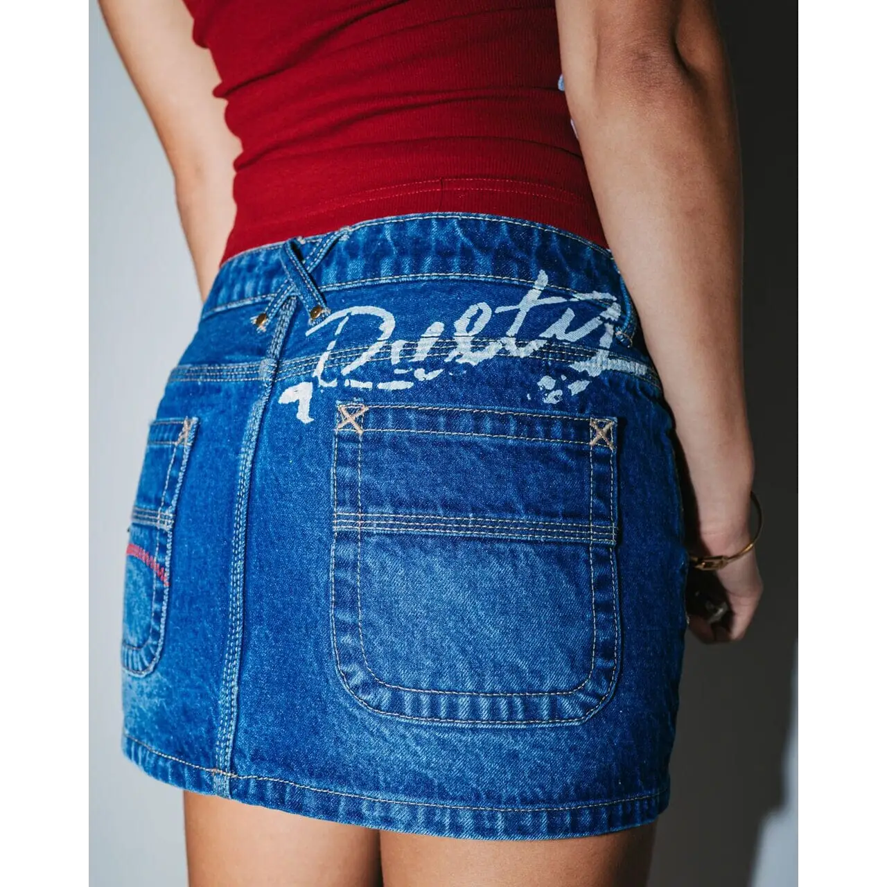 Rusty Shorty Low Rise Denim Micro Mini Skirt features a micro mini length with a low-rise fit, made from 100% cotton indigo denim for classic durability and comfort.