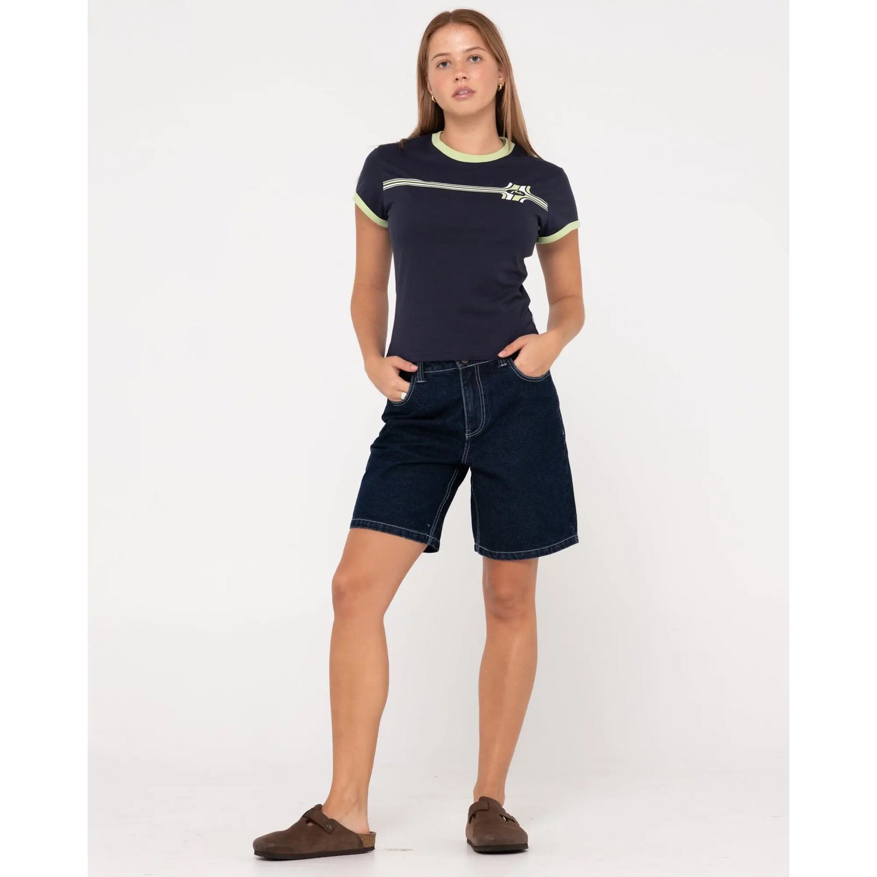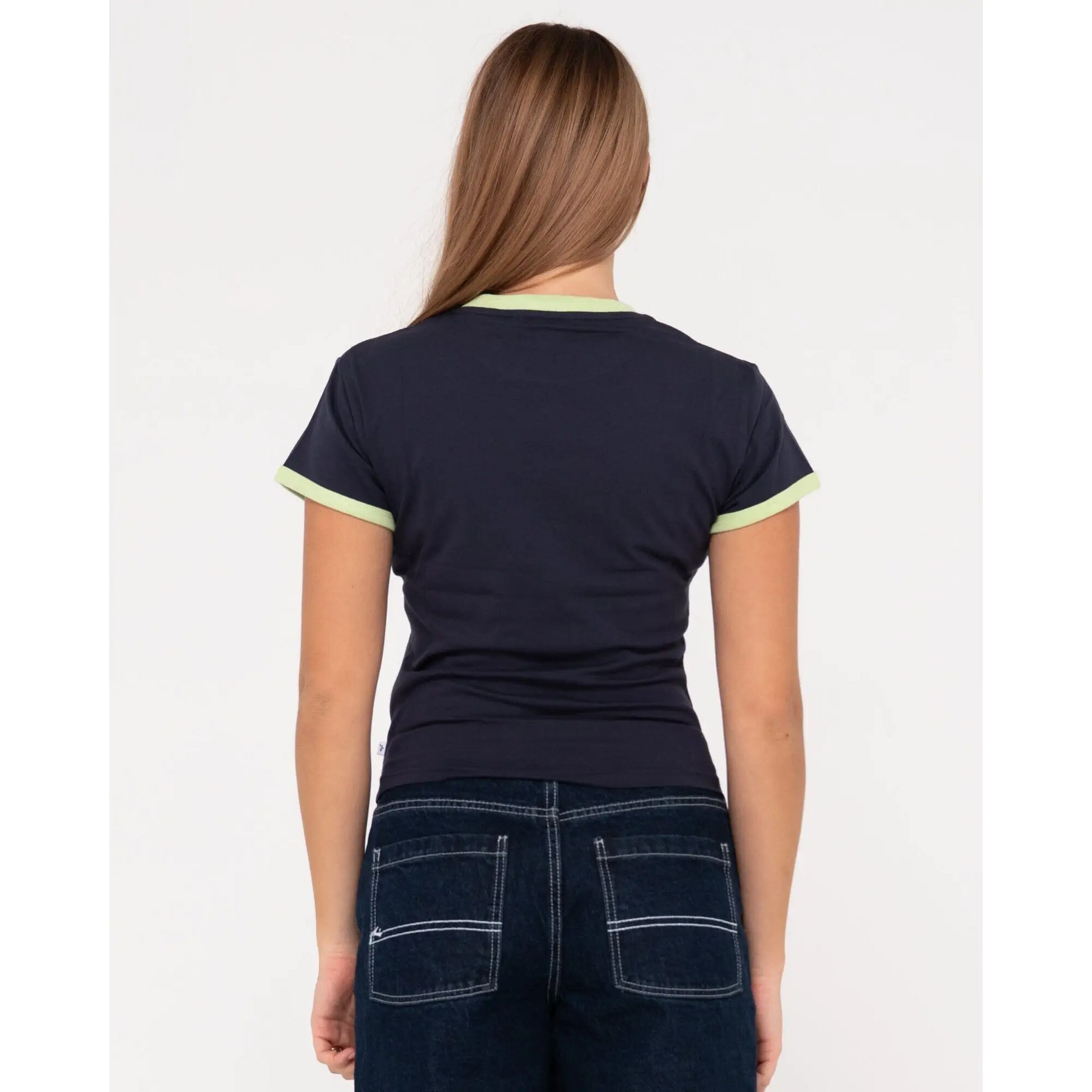 Short Sleeve Skimmer Ringer Tee With Contrast Binding And Front Graphic. Material: 100% Cotton Jersey