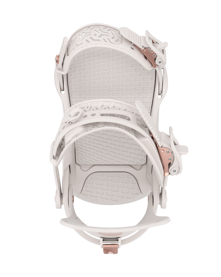 These bindings feel lively yet supportive with medium flex (6/10) that encourages confident turns while forgiving early mistakes. The Stage 5 Duraflex baseplate keeps weight low for quick responsiveness, and EXT thermoformed EVA bushings absorb chatter for comfortable resort laps. Exoframe 3.0 ankle straps and TS 2.1 toe straps provide secure, pressure-free fit that works with various boot shapes, perfect for intermediate women exploring groomers, bumps, and light park.