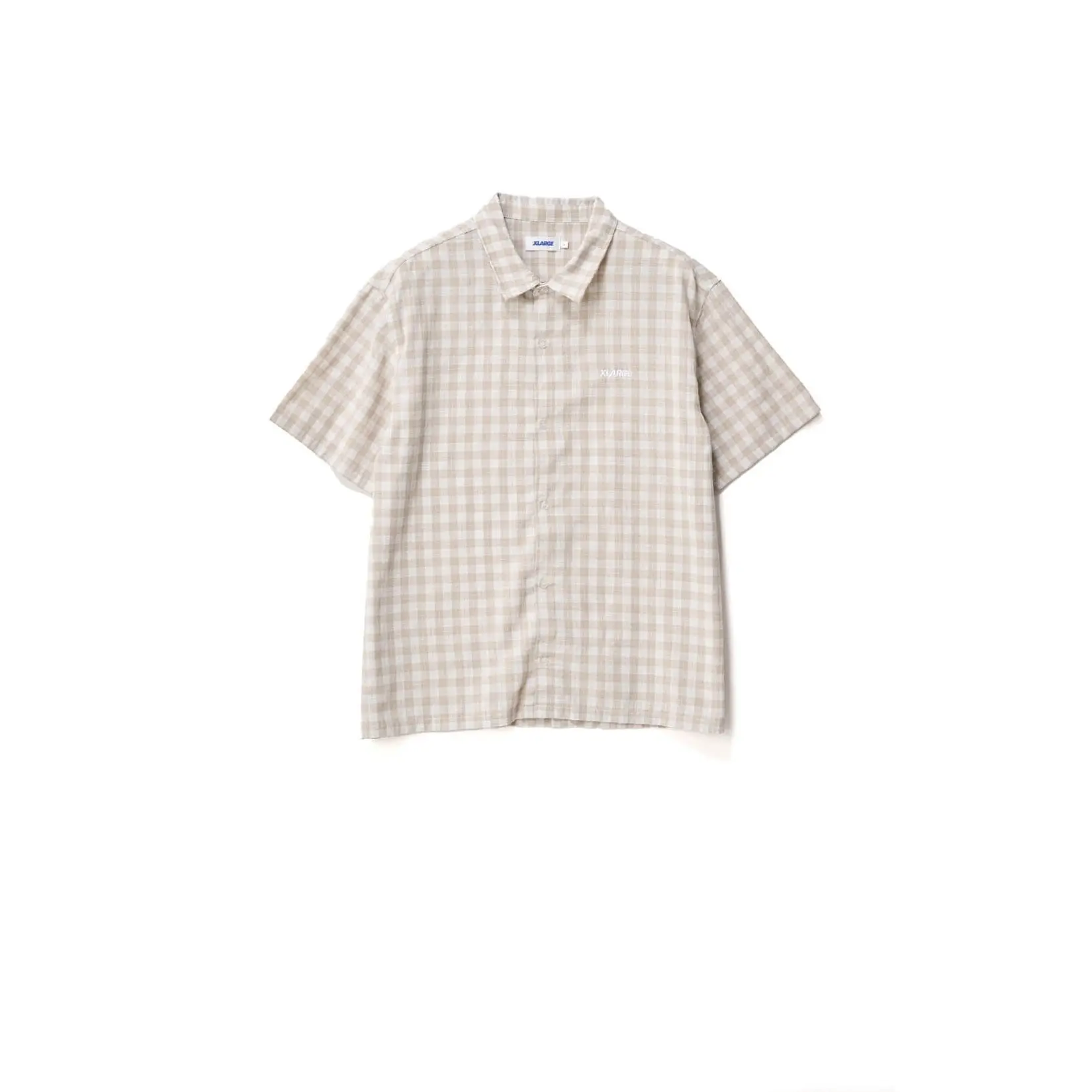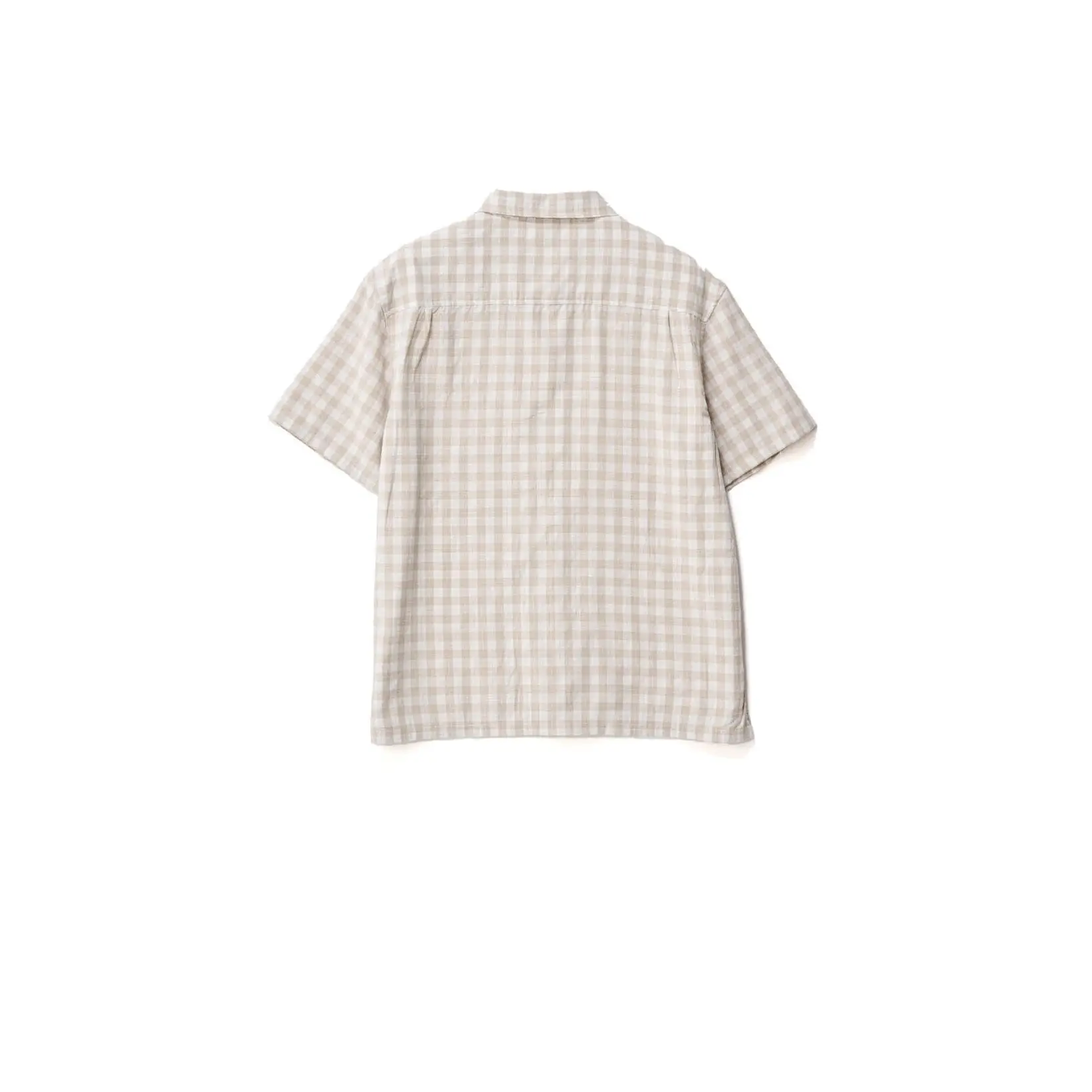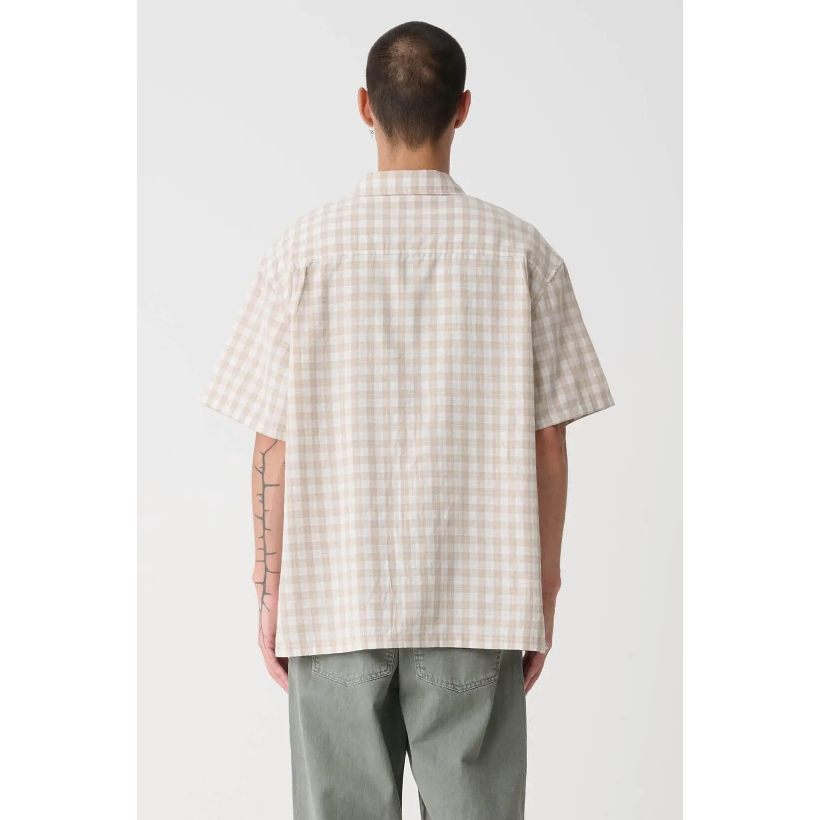 The 91 Oxford Shirt in Tan and White is an oversized box-fit traditional short sleeve shirt.