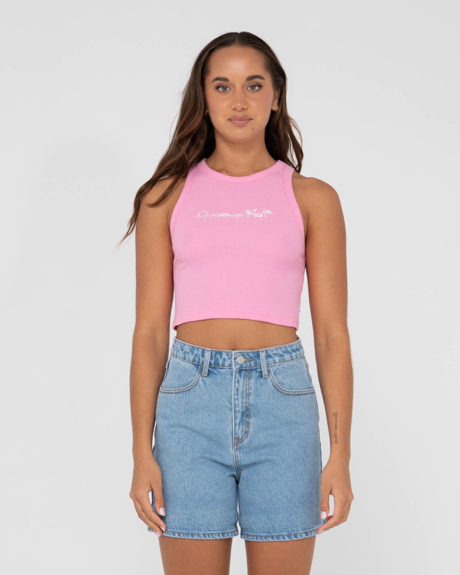 Fitted Sleeveless Tank With Front Screen Print And Racer Cut Back Detail.